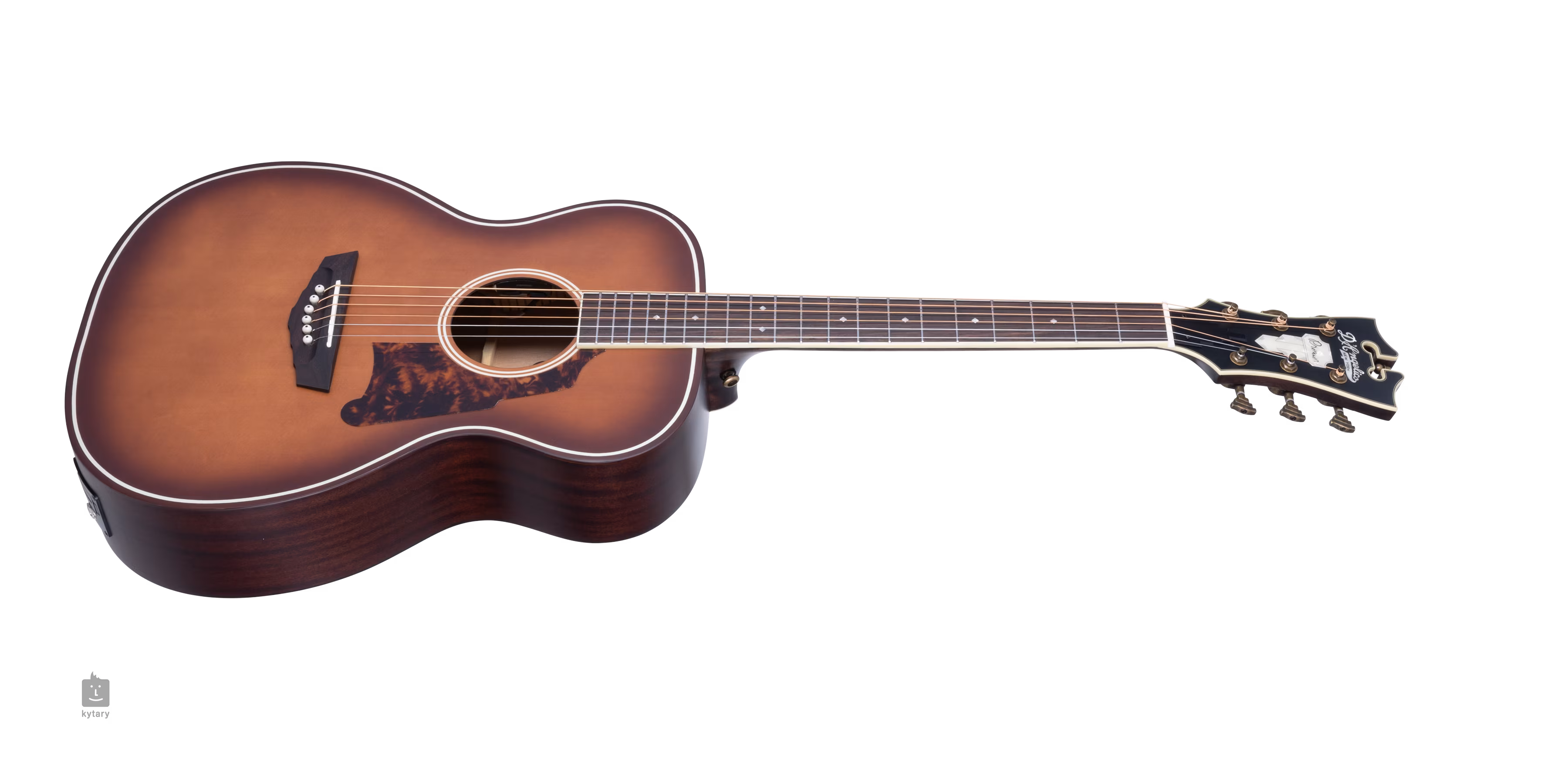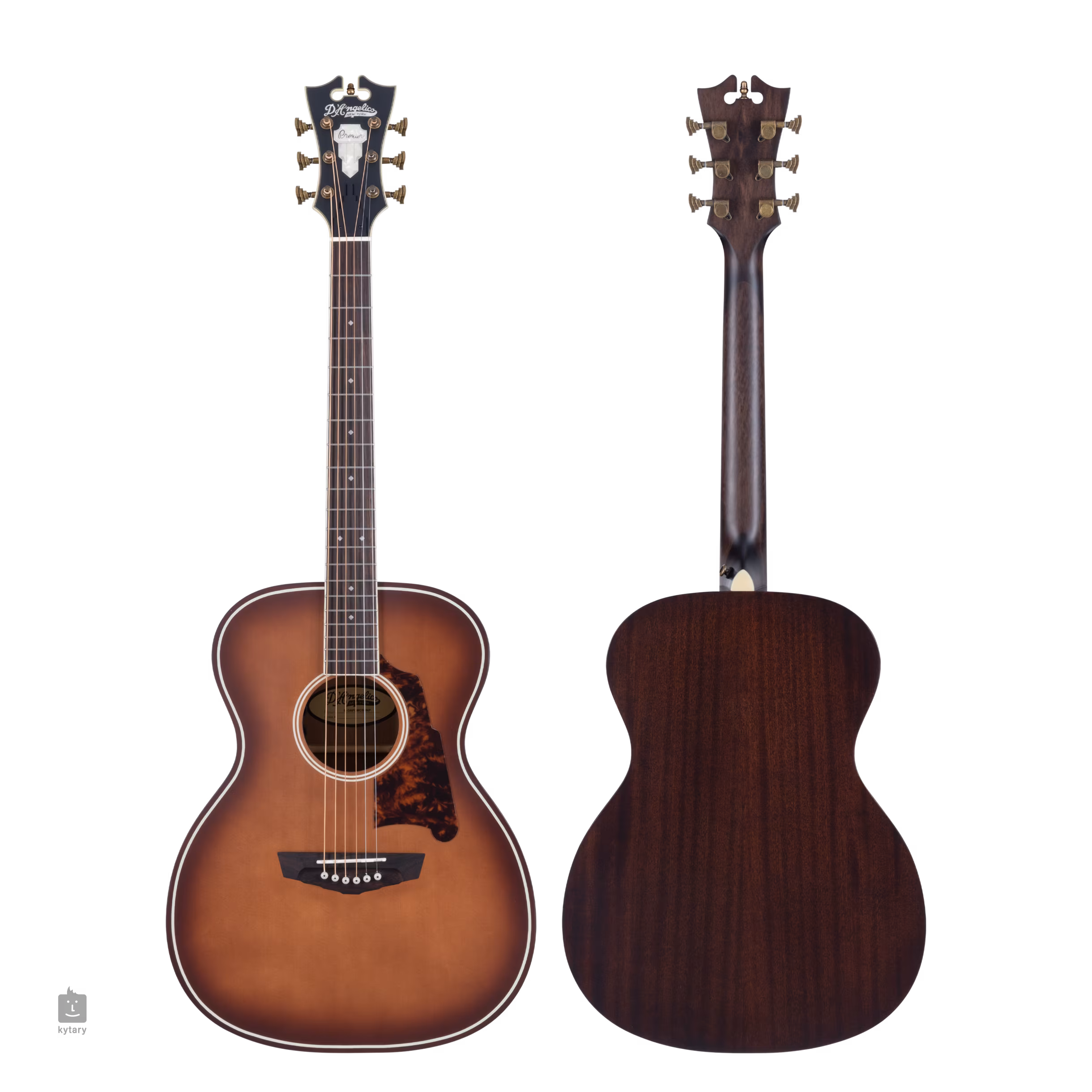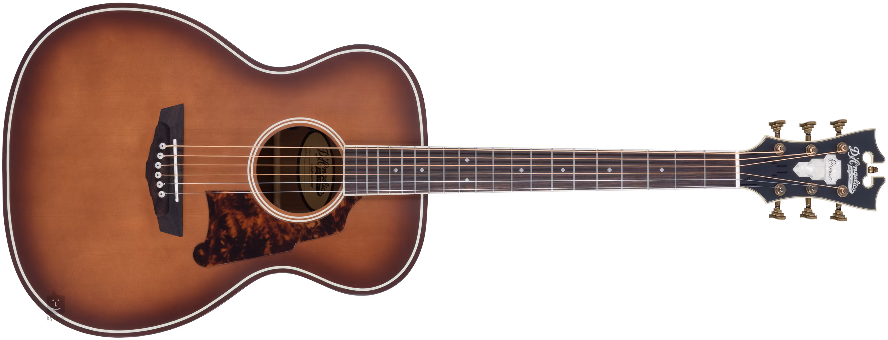 Der Korpus der Gitarre wird durch eine Kopfplatte in der traditionellen Form der D'Angelico-Instrumente ausgeglichen, die mit dem Firmenlogo aus Perlmuttimitat verziert ist. Die Saiten werden über einen Knochensattel und einen Nullbund in Stairstep-Wave-Stimmmechaniken und einem Palisandergriffbrett befestigt. Der stilvolle Look der D'Angelico-Gitarren wird durch Antique Bronze-Hardware, Ebenholz-Versteifungskappen und Art-Deco-Stil-Elemente unterstrichen - sei es die Form der Kopfplatte, das Design der Stimmmechanik, die Positionsmarkierungen auf dem Griffbrett oder die neu gestaltete Form der Scalini-Pickguards.