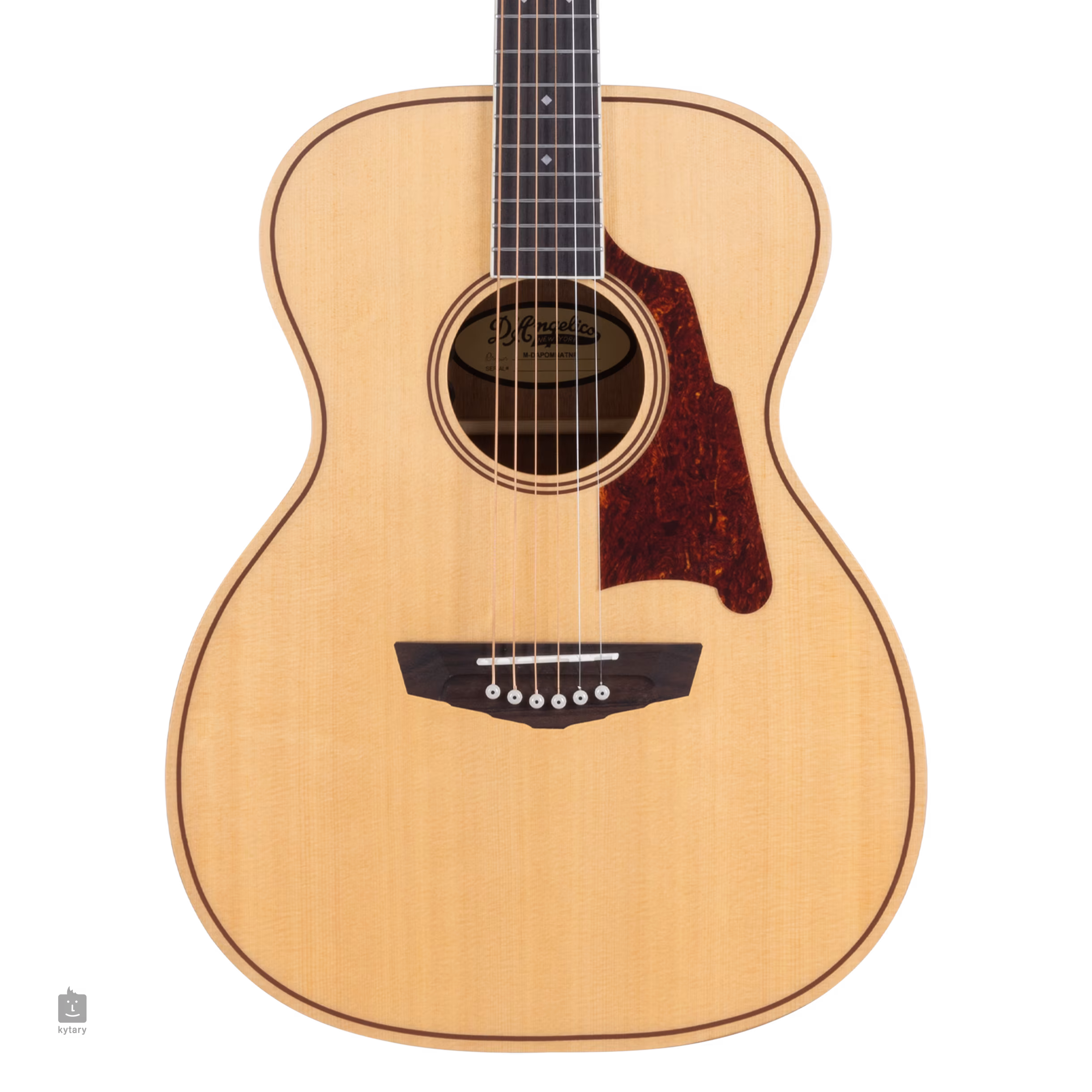 Der Korpus der Gitarre wird durch eine Kopfplatte in der traditionellen Form der D'Angelico-Instrumente ausgeglichen, die mit dem Firmenlogo aus Perlmuttimitat verziert ist. Die Saiten werden über einen Knochensattel und einen Nullbund in Stairstep-Wave-Stimmmechaniken und einem Palisandergriffbrett befestigt. Der stilvolle Look der D'Angelico-Gitarren wird durch Antique Bronze-Hardware, Ebenholz-Versteifungskappen und Art-Deco-Stil-Elemente unterstrichen - sei es die Form der Kopfplatte, das Design der Stimmmechanik, die Positionsmarkierungen auf dem Griffbrett oder die neu gestaltete Form der Scalini-Pickguards.