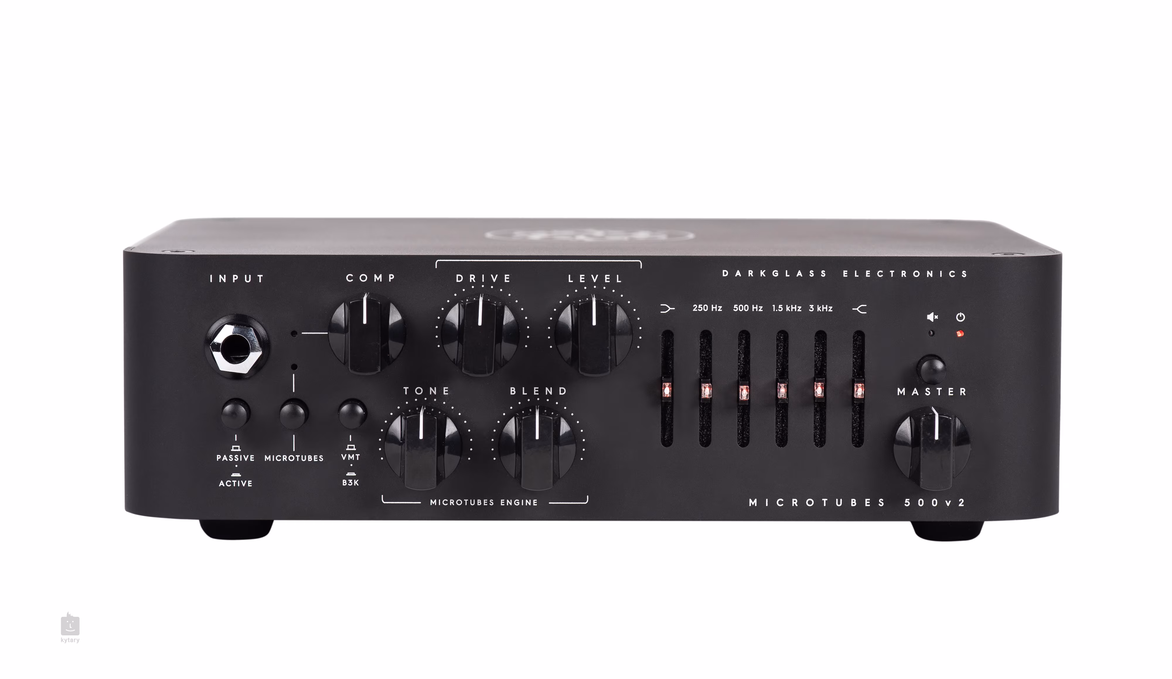 Sein Herzstück ist ein verbesserter, rein analoger Vorverstärker und ein 500-Watt-Class-D-Verstärker. Detaillierte Klangbearbeitungsmöglichkeiten bietet ein grafischer Sechsband-Equalizer mit extra leisem Betrieb, komplett mit TONE-, BLEND-Potentiometern (zur Einstellung des Verhältnisses von verzerrtem zu cleanem Sound) oder B3K/VMT-Schaltern (B3K steht für eine aggressivere Verzerrung, VMT für einen Vintage-Sound) und Mikroröhren. Die Active/Passive-Taste passt den Verstärker auch an die aktive/passive Elektronik Ihres Basses an.