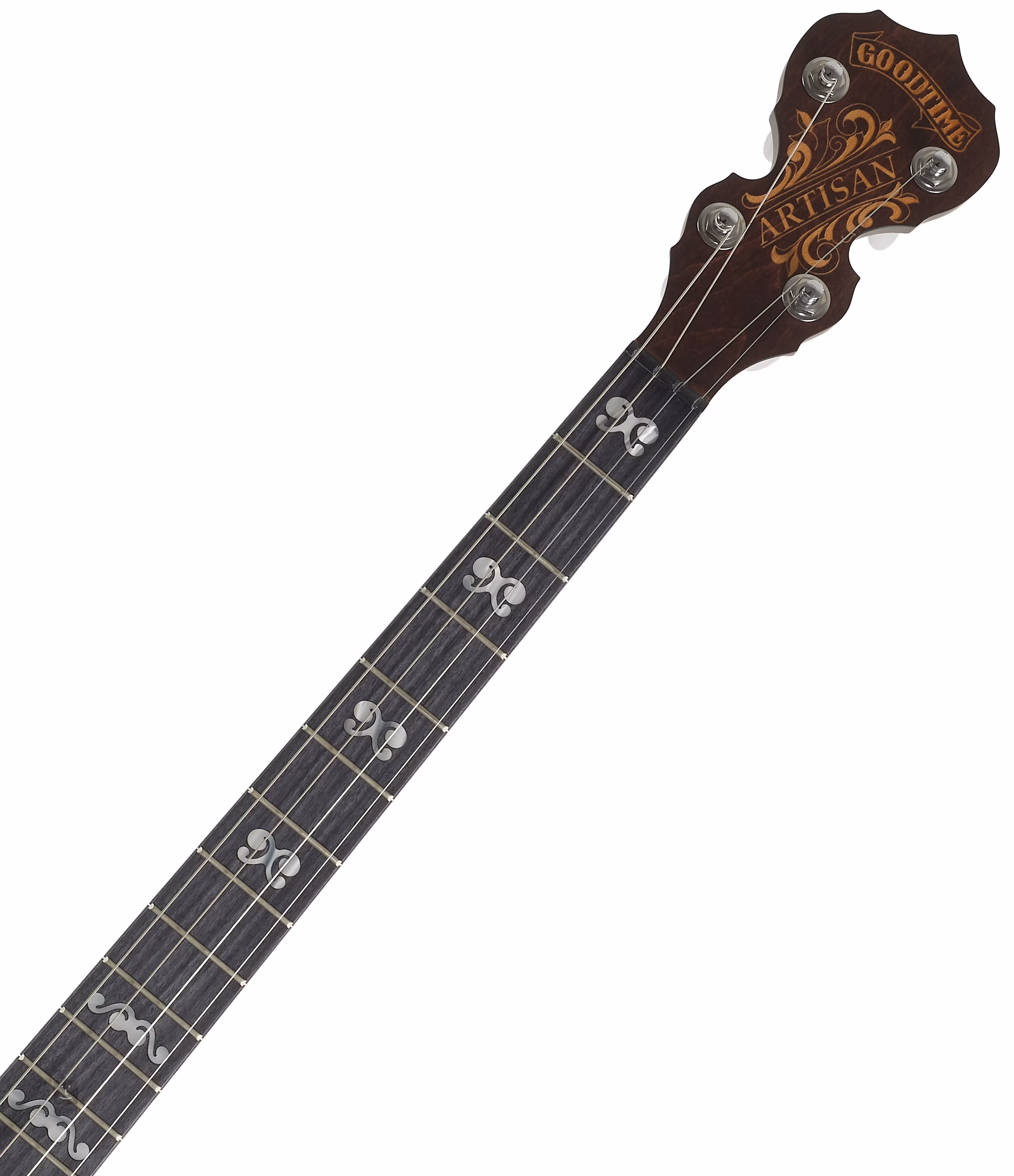 Die Artisan-Banjos unterscheiden sich von den "blonden" Banjos der Goodtime-Linie durch ihren dunkel gebeizten Ahornhals. Das Artisan Goodtime Two 19-Fret Tenor Four-String Banjo ist ein Instrument mit kürzerer Mensur, das wie eine Mandoline oder Geige in Quintintervallen (C, G, D, A) gestimmt ist. Es ist ein Banjo mit einem Resonator, d.h. einer gewölbten, gebeizten Abdeckung auf dem Boden aus einer Schicht Ahorn mit zwei Schichten Pappel, die dem Instrument einen klaren Ton mit deutlich besserer Klangprojektion verleiht als ein Banjo mit offenem Boden.