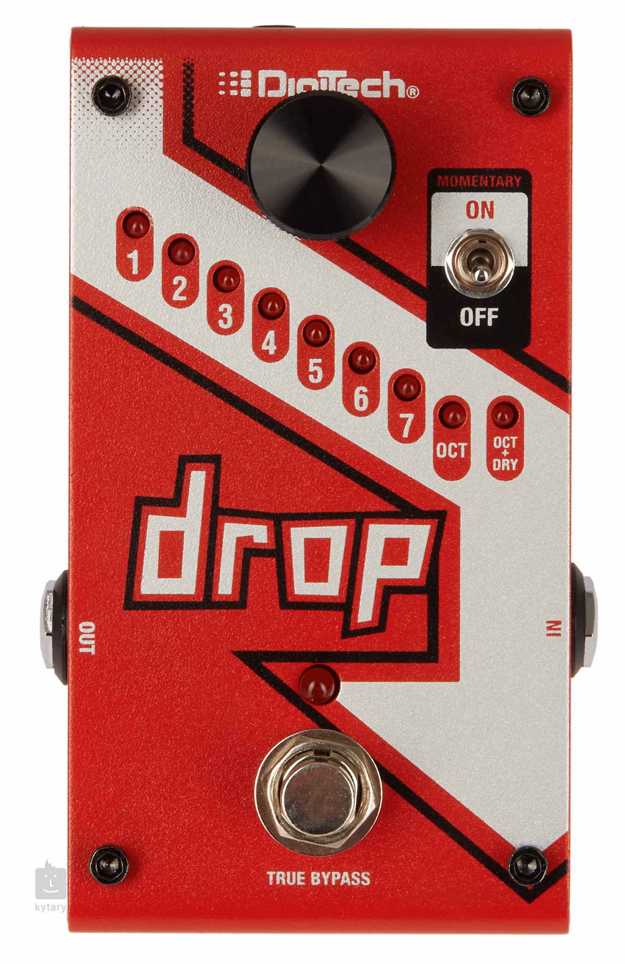 Es handelt sich um einen polyphonen Drop-Down-Effekt mit einfachen Bedienelementen. Mit dem Potentiometer wählen Sie das Intervall, um das das Instrument verstimmt wird (1, 2, 3, 4, 5, 6, 7 Halbtöne, Oktave und Oktave mit beigemischtem Trockensignal). Mit dem Momentary-Schalter legen Sie fest, ob sich der Effekt so verhalten soll, dass die Unterstimmung nur vorübergehend ist, solange der Hauptschalter gedrückt gehalten wird, oder ob er sich wie ein klassischer Effekt mit On/Off-Funktion verhalten soll.