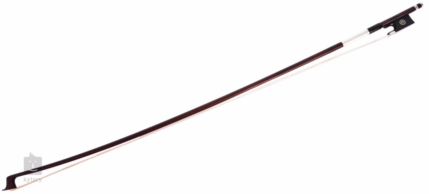 Der Geigenbogen mit achteckigem Stangenquerschnitt aus ausgesuchtem Farnambuco höchster Qualität hat natürliches Rosshaar, einen Ebenholzfrosch mit gespaltenem Keil, der mit einem Pariser Auge und einer geschnittenen Scheibe verziert ist, eine Weißmetallwicklung und eine dreiteilige Spannschraube mit Perlmuttauge.