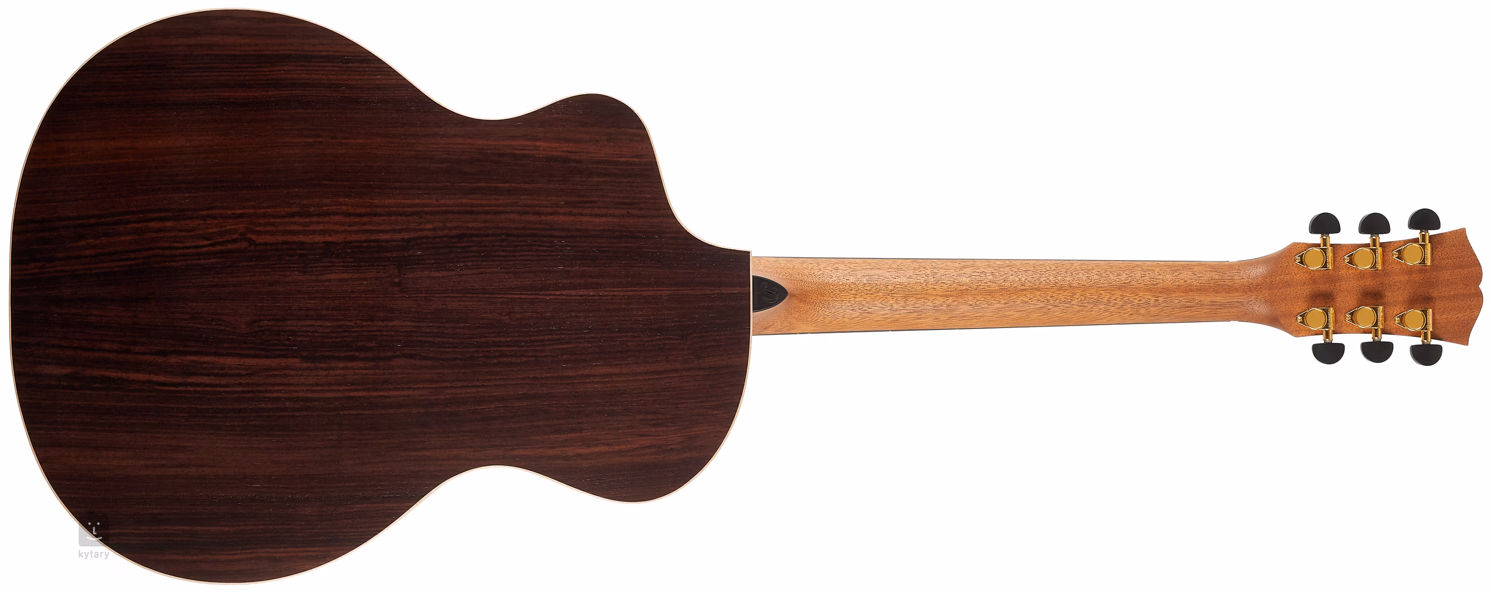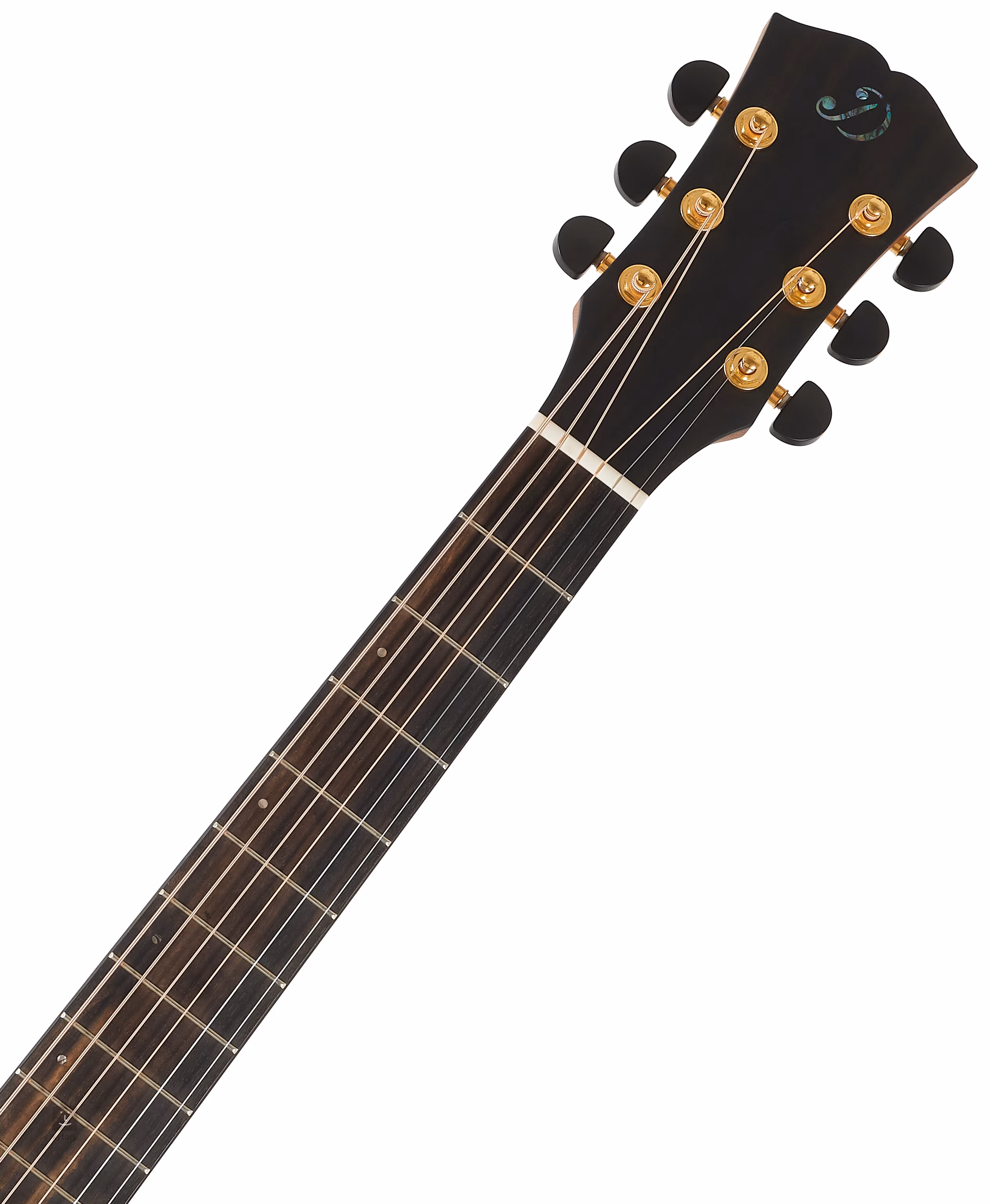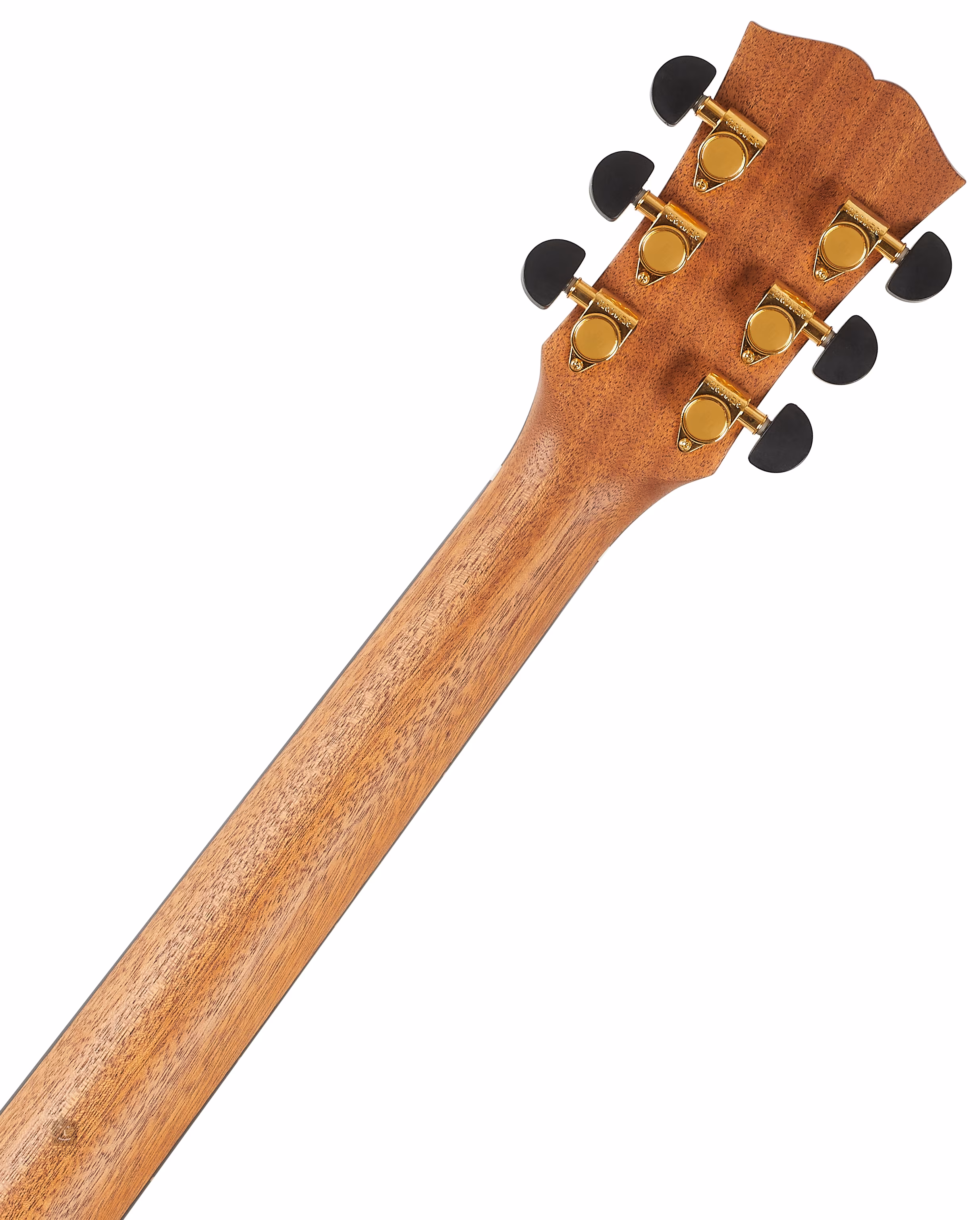 Der Mahagoni-Hals ist mit einem Ebenholz-Griffbrett mit einundzwanzig Bünden verleimt. Die Saiten sind über einen Sattel und ein Griffbrett aus Knochen in Grover-Mechaniken mit Goldlackierung und einem Ebenholz-Griffbrett montiert. Das stilvolle Finish wird durch eine dekorative Rosette, ein Korpusbinding aus Riegelahorn, einen Mittelstreifen auf der Bodenplatte und ein Perlmutt-Firmenlogo auf der Kopfplatte (Abalone) akzentuiert.
