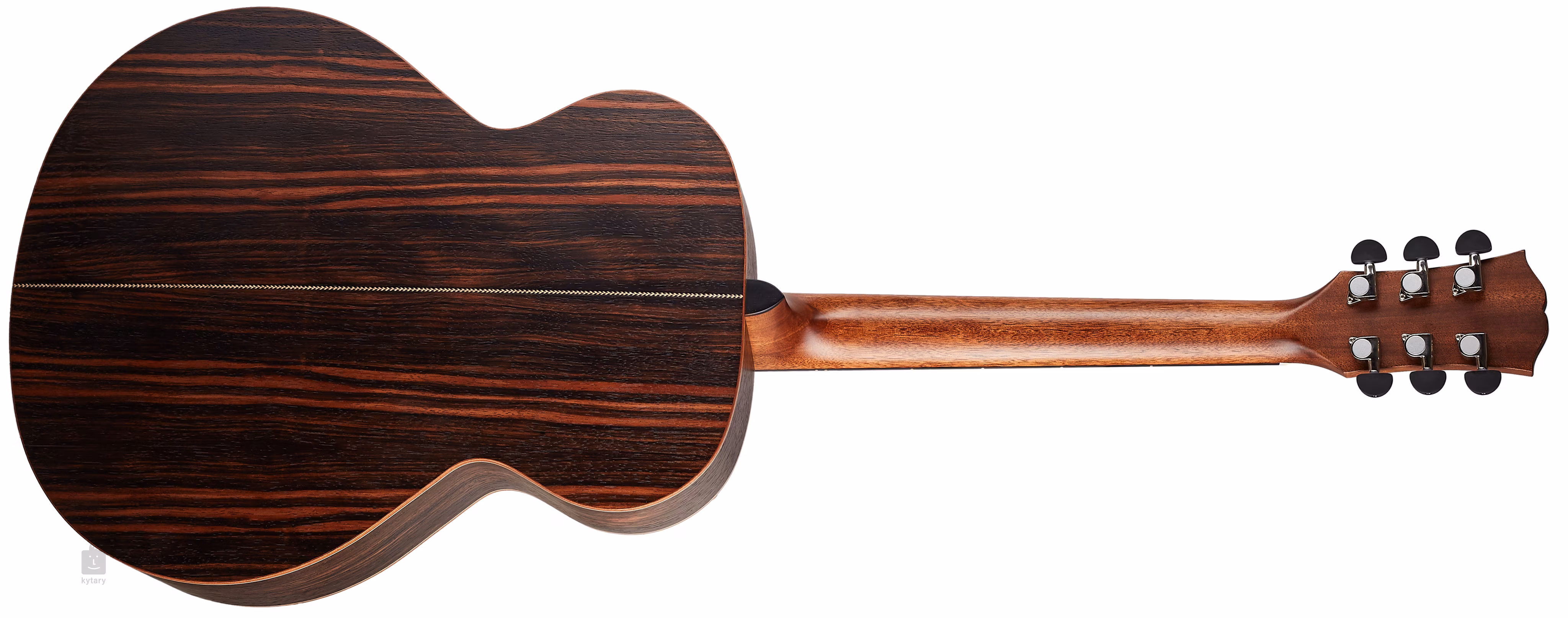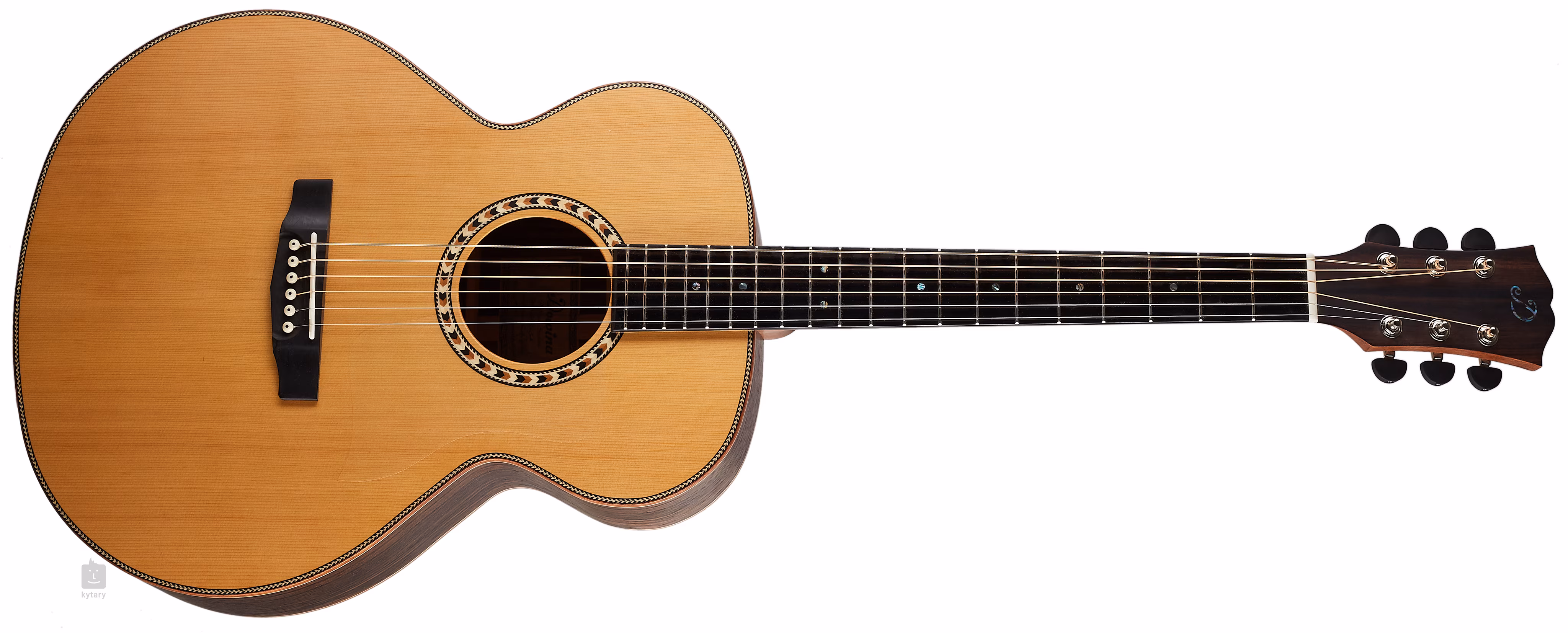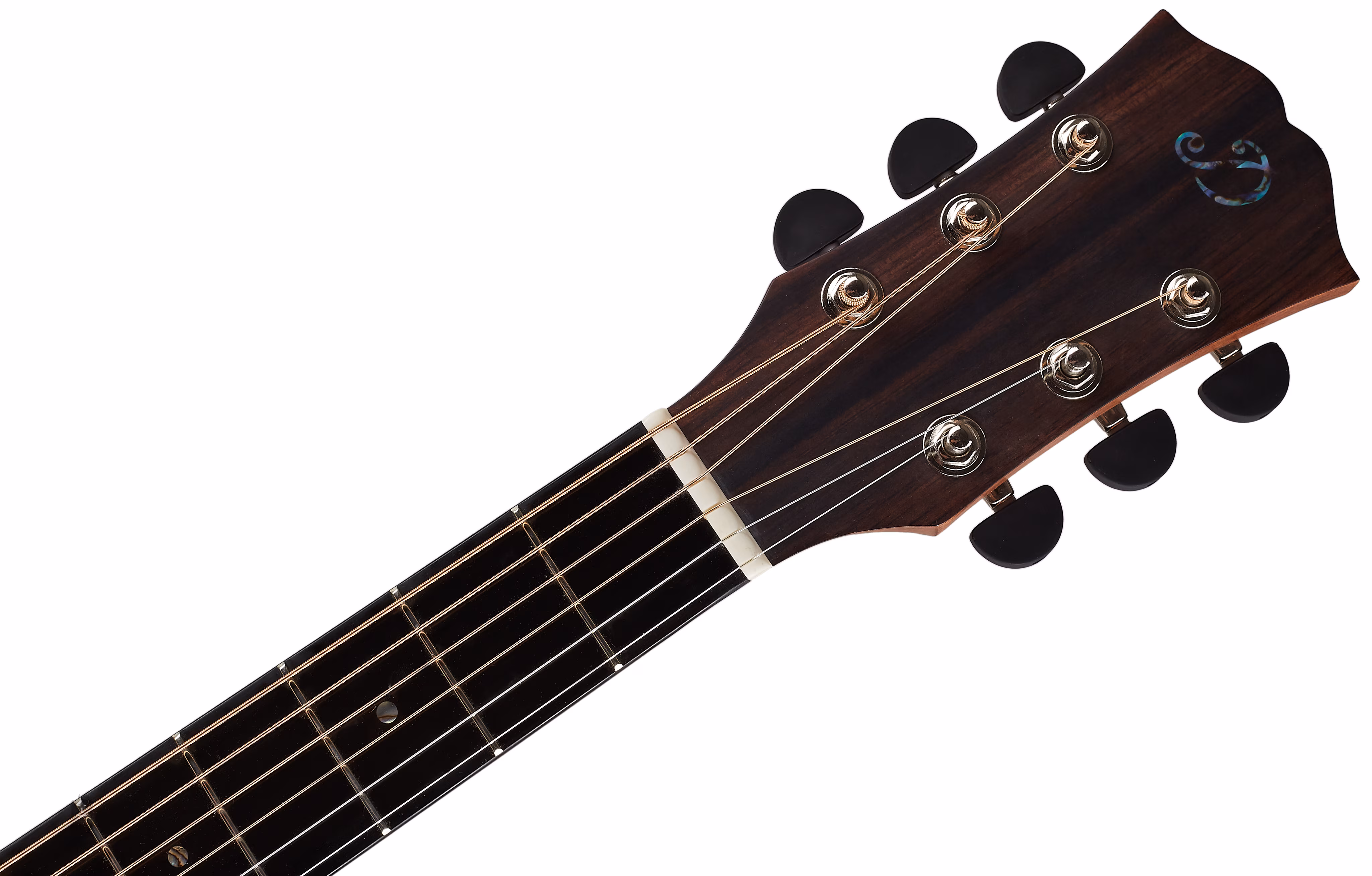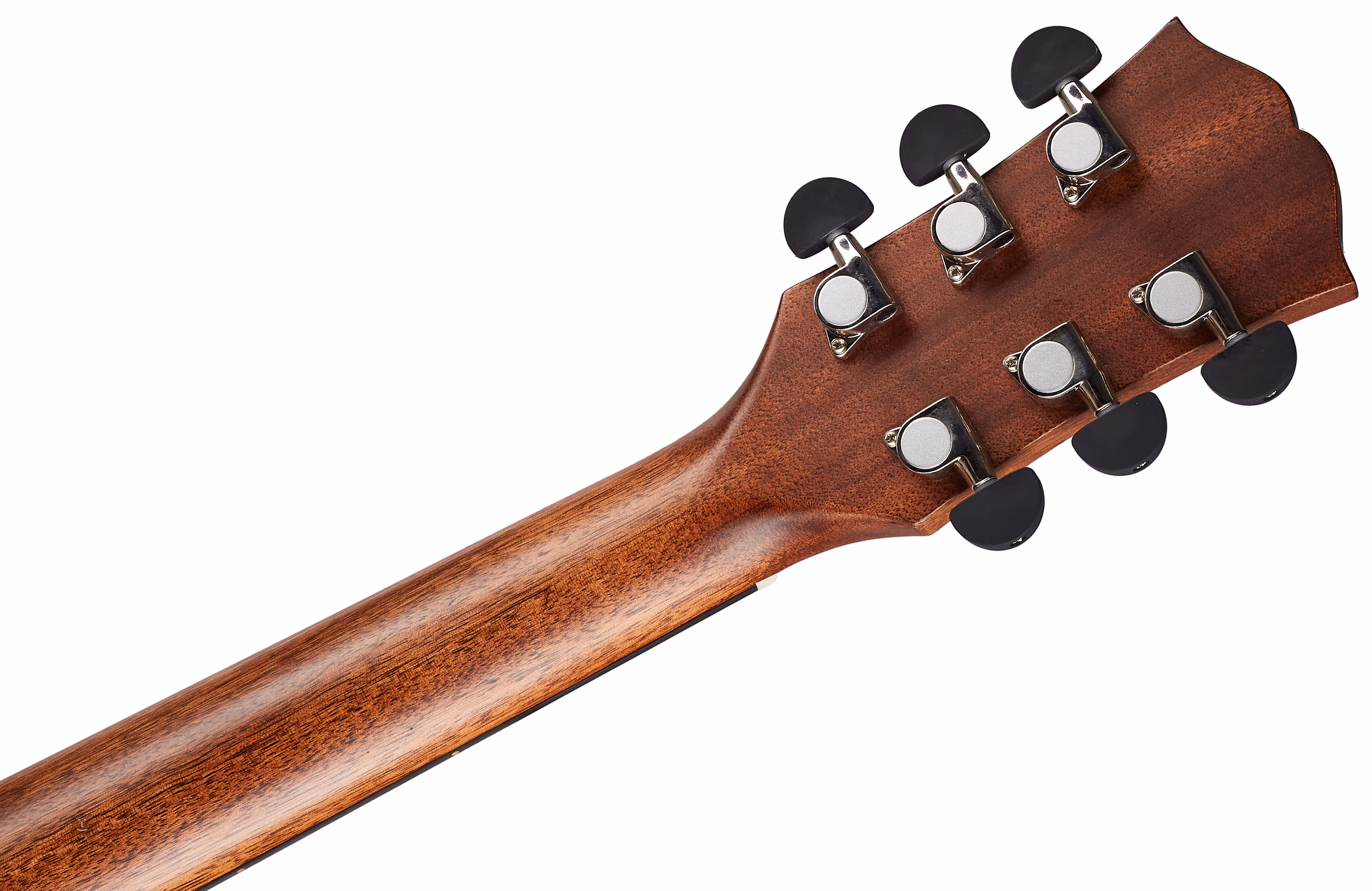 Auf den Nato-Hals ist ein ebonisiertes Hartholz-Griffbrett geleimt, das aufgrund seiner ähnlichen Eigenschaften als östliches Mahagoni" bezeichnet wird. Die Stimmstabilität wird durch die Befestigung der Saiten über den Knochen-Nullbund in der Grover-Mechanik und das Hartholz-Griffbrett gewährleistet. Die feine Verarbeitung wird durch Details in Form von Mahagoni-Korpusumrandung, Fischgrät-Decke und -Bodenplatte, Zierrosette, Perlmutt-Firmenlogo auf der Kopfplatte (Abalone) und Perlmutt-Dots auf dem Griffbrett akzentuiert.