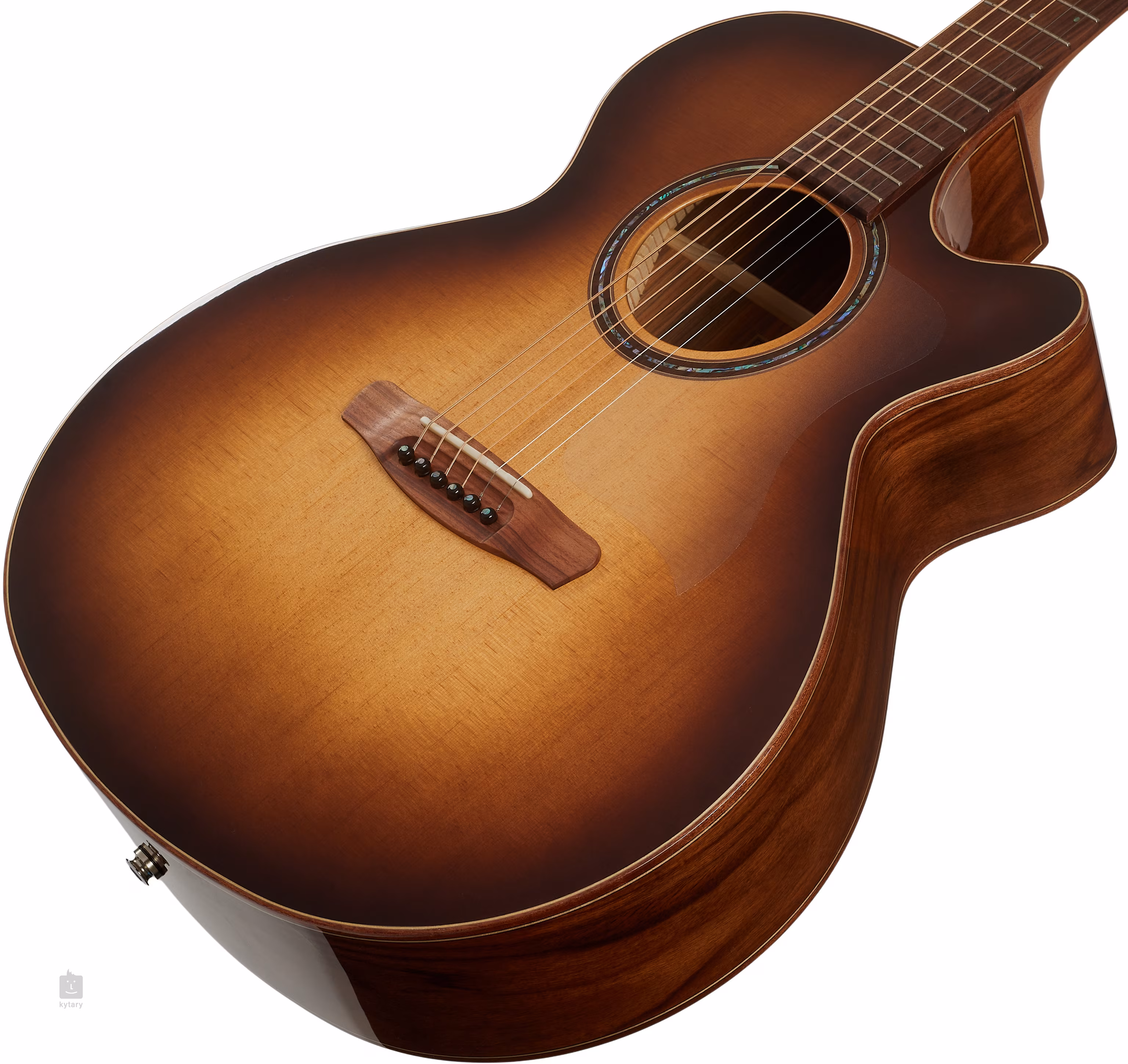 Der Hals ist aus Nato-Holz gefertigt, das aufgrund seiner ähnlichen Eigenschaften und seines Aussehens als „östliches Mahagoni“ bezeichnet wird. Die Stimmstabilität wird durch die Befestigung der Saiten in Gotoh-Mechaniken und einem Steg aus Pau Ferro gewährleistet. Die schöne Verarbeitung wird durch das Sunburst-Finish der Decke und Details wie die Mahagoni-Einfassung des Korpus, die Rosette aus Perlmutt- und Palisanderringen, das Perlmutt-Firmenlogo auf dem Kopf (Abalone) und die Perlmutt-Einlage am zwölften Bund des Griffbretts unterstrichen.