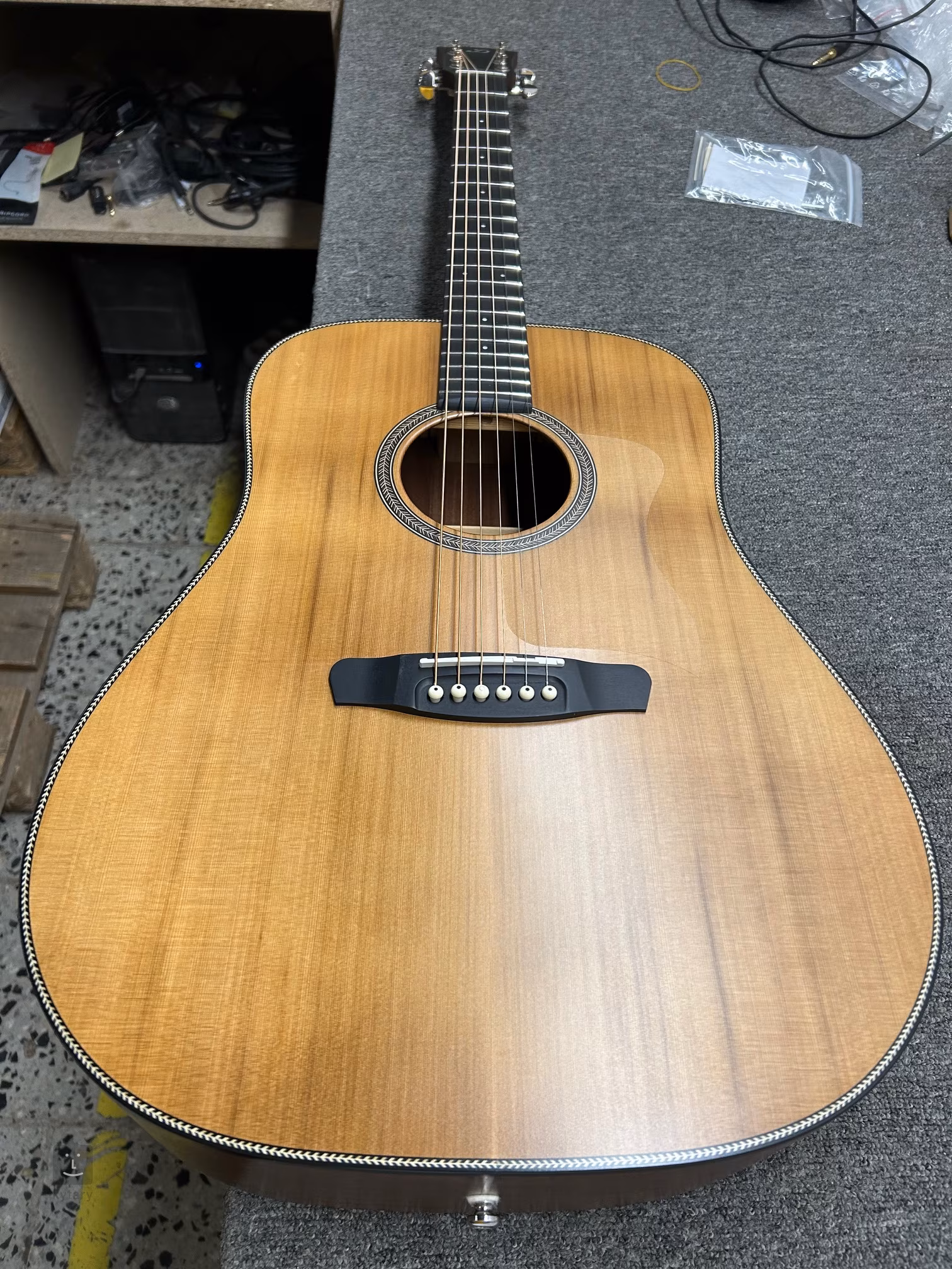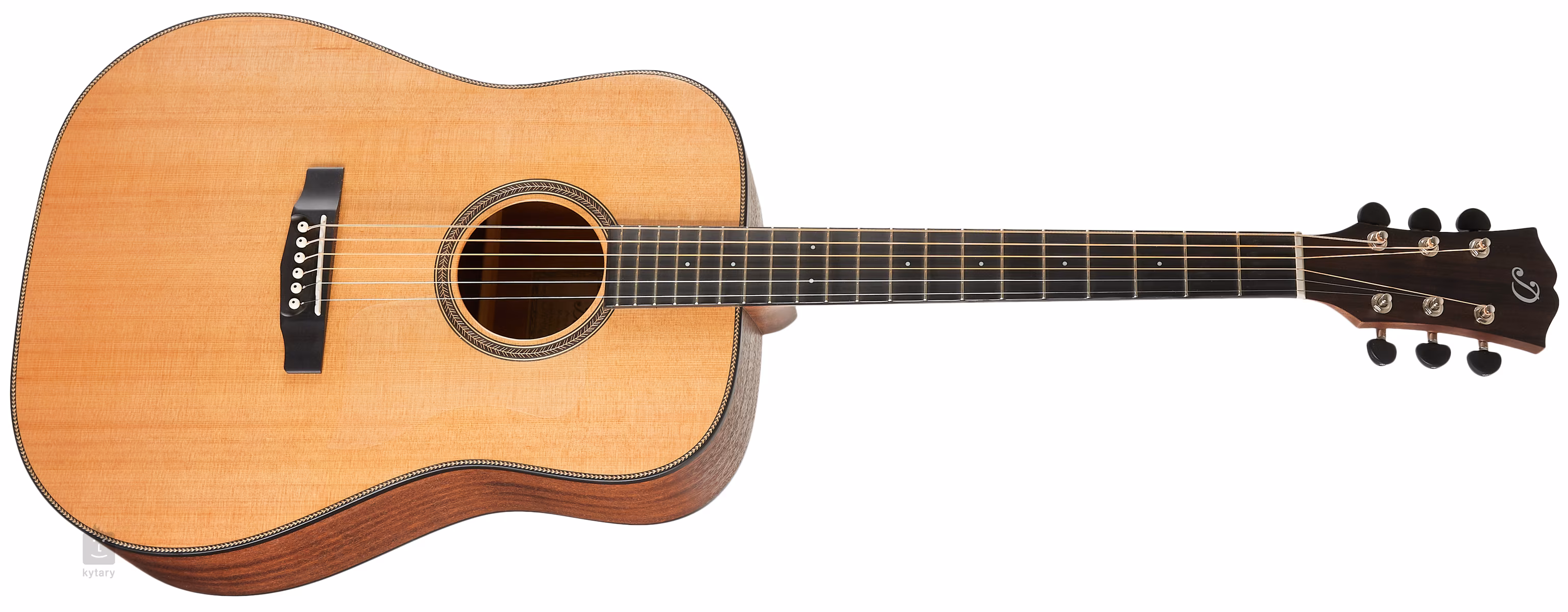 Die Dowina Rustica Rustica D aus der Antique-Serie ist eine Akustikgitarre mit der beliebten „Western“-Korpusform vom Typ Dreadnought. Die Decke der Gitarre ist aus massivem Zedernholz gefertigt, der Boden und die Zargen bestehen aus laminiertem Mahagoni. An den Hals aus Nato-Holz, das aufgrund seiner ähnlichen Eigenschaften auch als „östliches Mahagoni“ bezeichnet wird, ist ein Griffbrett aus ebonisiertem Hartholz geklebt. Die Saiten sind in firmeneigenen Mechaniken und einem Steg aus Hartholz befestigt. Die schöne Verarbeitung wird durch Details wie die beidseitige Einfassung des Korpus und die umlaufende Einlage der Decke und Rosette im Fischgrätenmuster unterstrichen. Die Geschichte der slowakischen Firma Dowina reicht bis ins Jahr 1979 zurück. Das ursprünglich auf Geigenbau spezialisierte Unternehmen hat sich im Bereich der Herstellung von Akustikgitarren etabliert, wobei es traditionelle Verfahren und sein Know-how im Geigenbau einsetzt und großen Wert auf die Auswahl der Materialien legt.