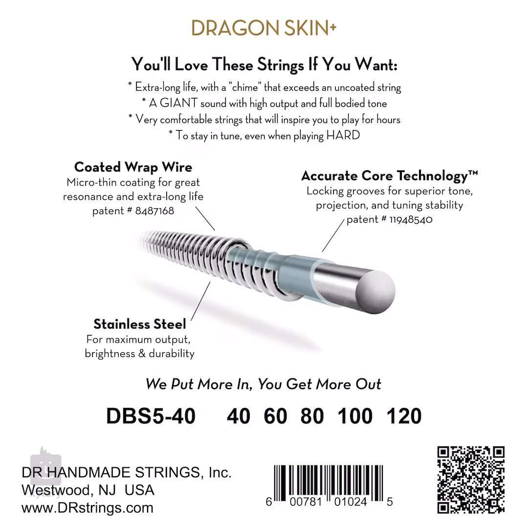 Die Dragon Skin+ Basssaiten von DR zeichnen sich durch einen sehr kräftigen und frequenzausgewogenen Klang aus. Eine spezielle Korrosionsschutzbeschichtung verleiht ihnen Widerstandsfähigkeit und eine besonders lange Lebensdauer. Darüber hinaus nutzen sie die patentierte Accurate Core-Technologie, die dank feiner Rillen am Saitenkern für einen festen Halt des Wickeldrahtes und damit für eine stabile Stimmung sorgt. Dieser Satz besteht aus rostfreiem Stahl, der einen durchdringenden, klangvollen Ton und hohe Widerstandsfähigkeit bietet.