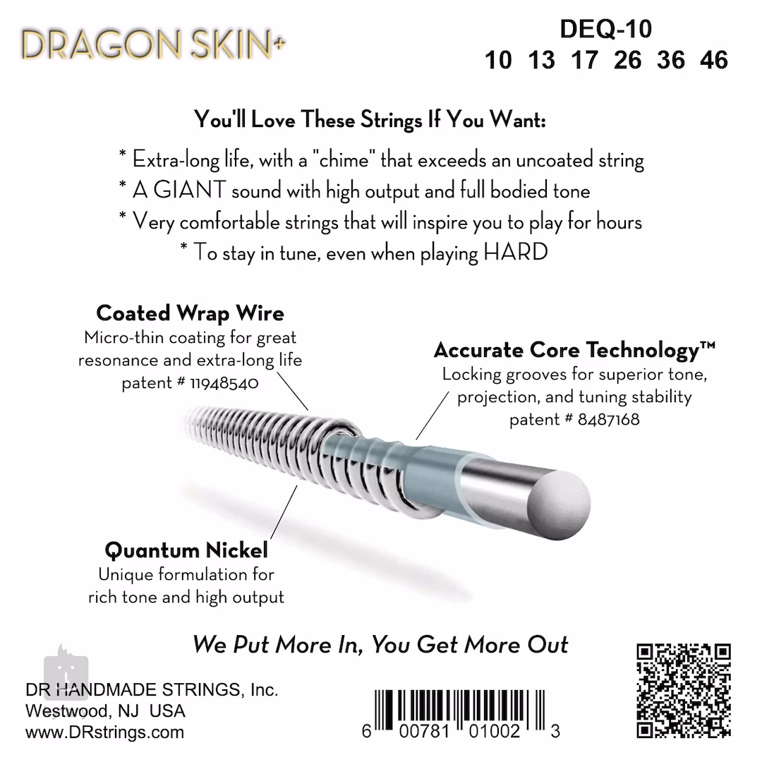 Die Dragon Skin+ Saiten von DR zeichnen sich durch einen sehr kraftvollen und frequenzausgewogenen Klang aus. Eine spezielle Korrosionsschutzbeschichtung verleiht ihnen Widerstandsfähigkeit und eine besonders lange Lebensdauer. Darüber hinaus nutzen sie die patentierte Accurate Core-Technologie, die dank feiner Rillen im Saitenkern für einen festen Halt des Wickeldrahtes und damit für eine stabile Stimmung und einen außergewöhnlich durchdringenden Klang sorgt. Dragon Skin+ sind einfach Saiten wie keine anderen – sie werden Ihnen sehr lange dienen und nur das Beste aus sich herausholen!