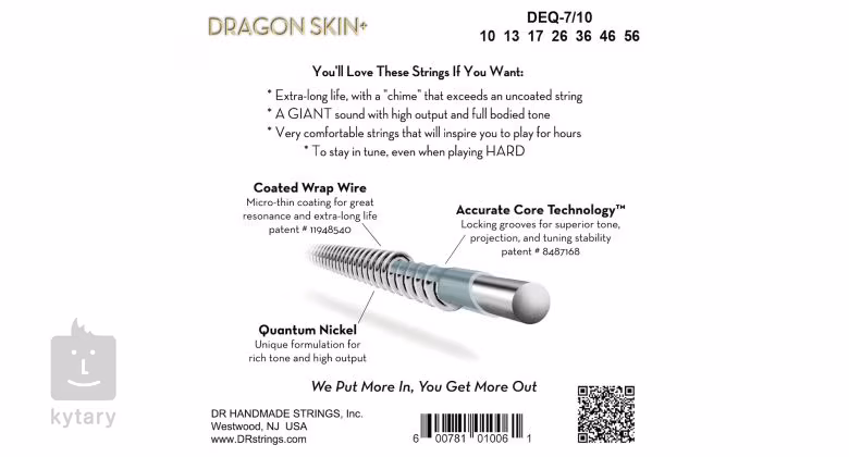 Die Dragon Skin+ Saiten von DR haben einen sehr kräftigen und frequenzbalancierten Ton. Eine spezielle Anti-Korrosions-Beschichtung verleiht ihnen Haltbarkeit und zusätzliche Langlebigkeit. Darüber hinaus verwenden sie die patentierte Accurate Core Technologie, die dank der feinen Rillen im Saitenkern einen festen Halt auf dem umsponnenen Draht für eine stabile Stimmung und einen außergewöhnlich durchdringenden Ton gewährleistet. Kurz gesagt, Dragon Skin+ Saiten sind wie keine anderen - sie werden Ihnen sehr lange dienen und Ihnen das Beste von sich geben!