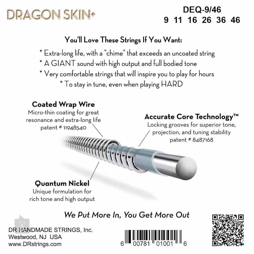 Die Dragon Skin+ Saiten von DR zeichnen sich durch einen sehr kraftvollen und frequenzausgewogenen Klang aus. Eine spezielle Korrosionsschutzbeschichtung verleiht ihnen Widerstandsfähigkeit und eine besonders lange Lebensdauer. Darüber hinaus nutzen sie die patentierte Accurate Core-Technologie, die dank feiner Rillen im Saitenkern für einen festen Halt des Wickeldrahtes und damit für eine stabile Stimmung und einen außergewöhnlich durchdringenden Klang sorgt. Dragon Skin+ sind einfach Saiten wie keine anderen – sie werden Ihnen sehr lange dienen und nur das Beste aus sich herausholen!