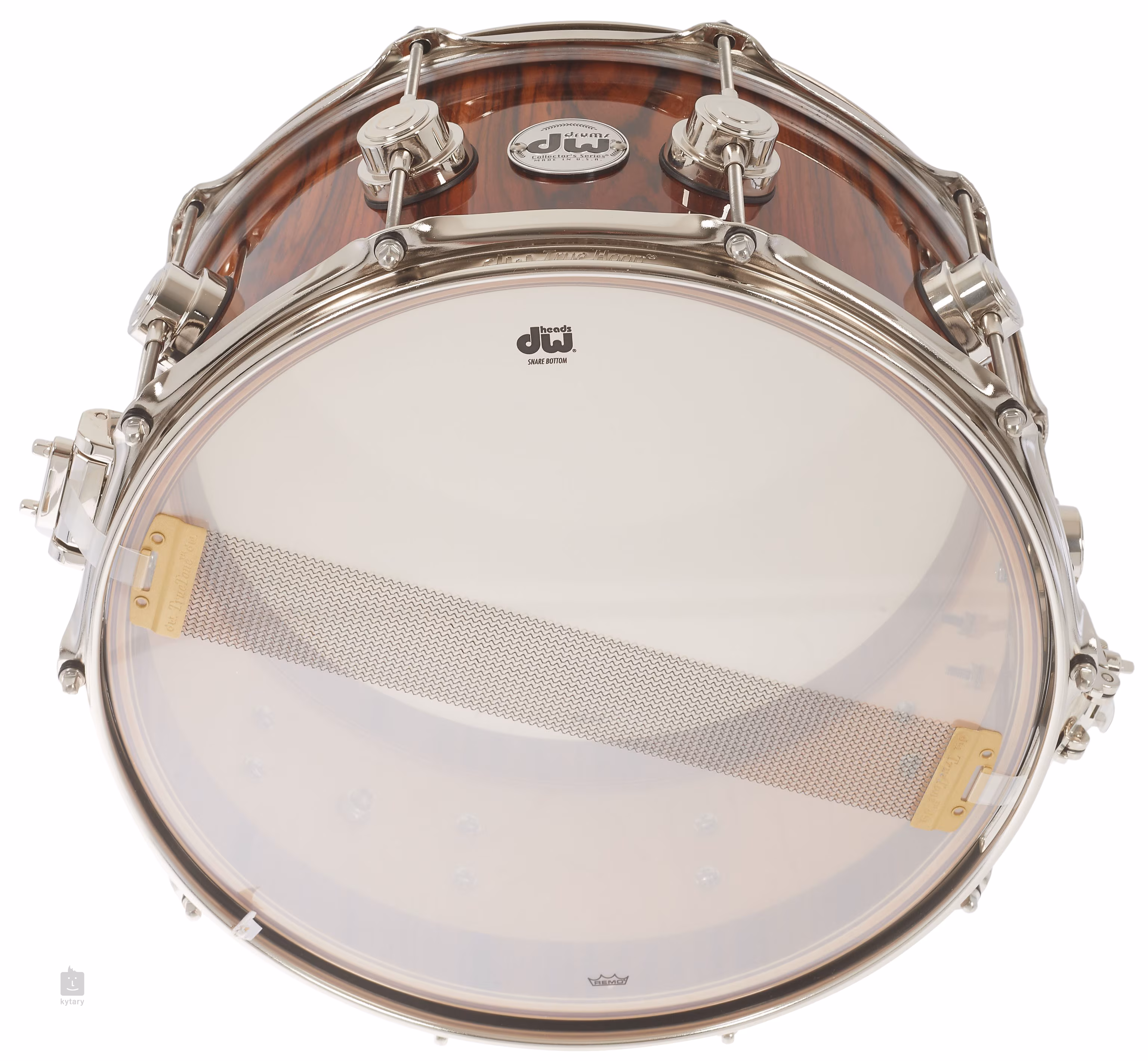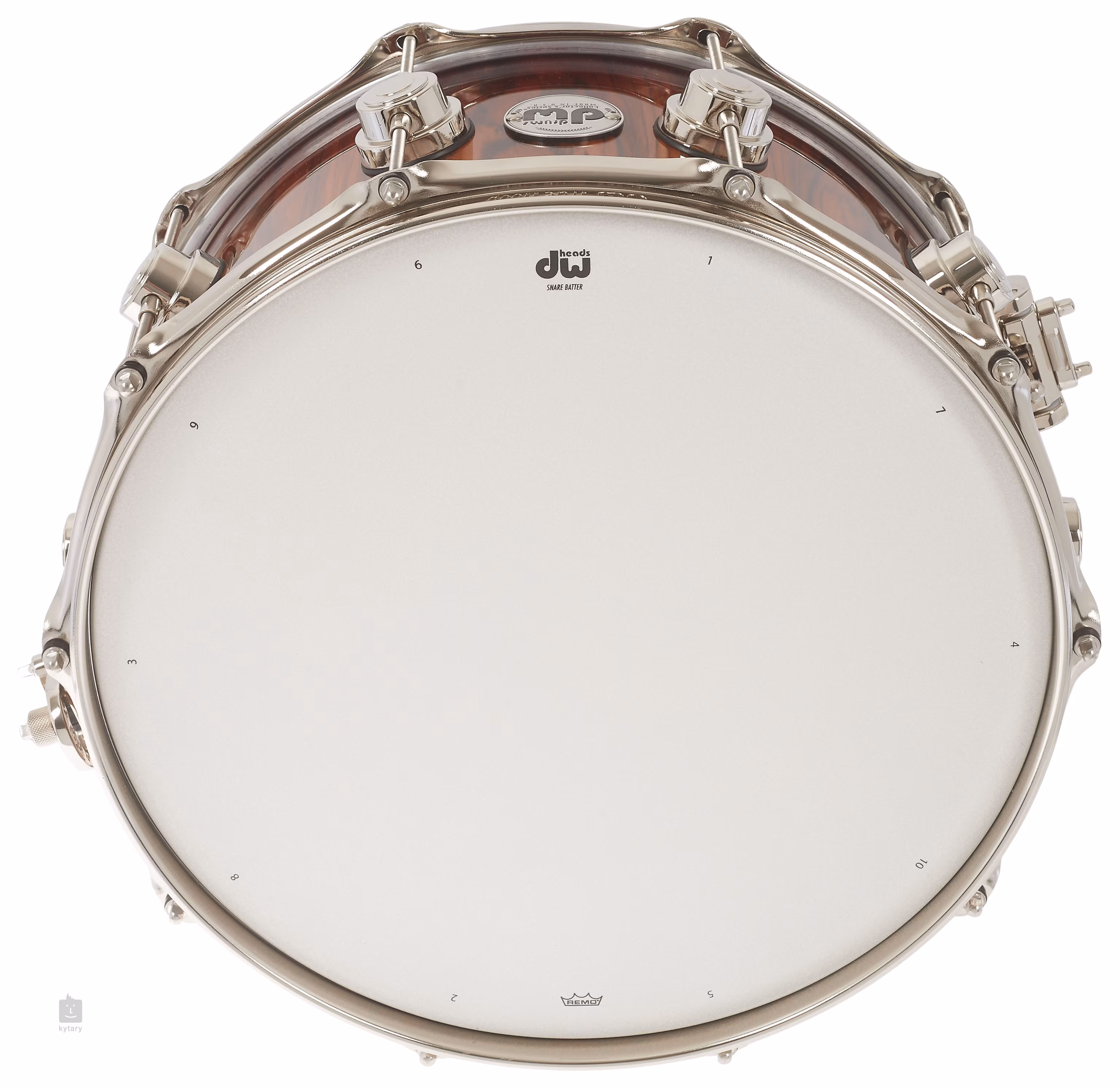 Kleine Trommel zum fünfzehnten Geburtstag der legendären Marke DW. Fünfzehn Lagen Ahorn sorgen für einen ehrlichen Klang, das Fell ist mit Remo-Bälgen ausgestattet. Die verchromte Hardware wird durch eine lackierte Oberfläche mit einer auffälligen Holzmaserung ergänzt.