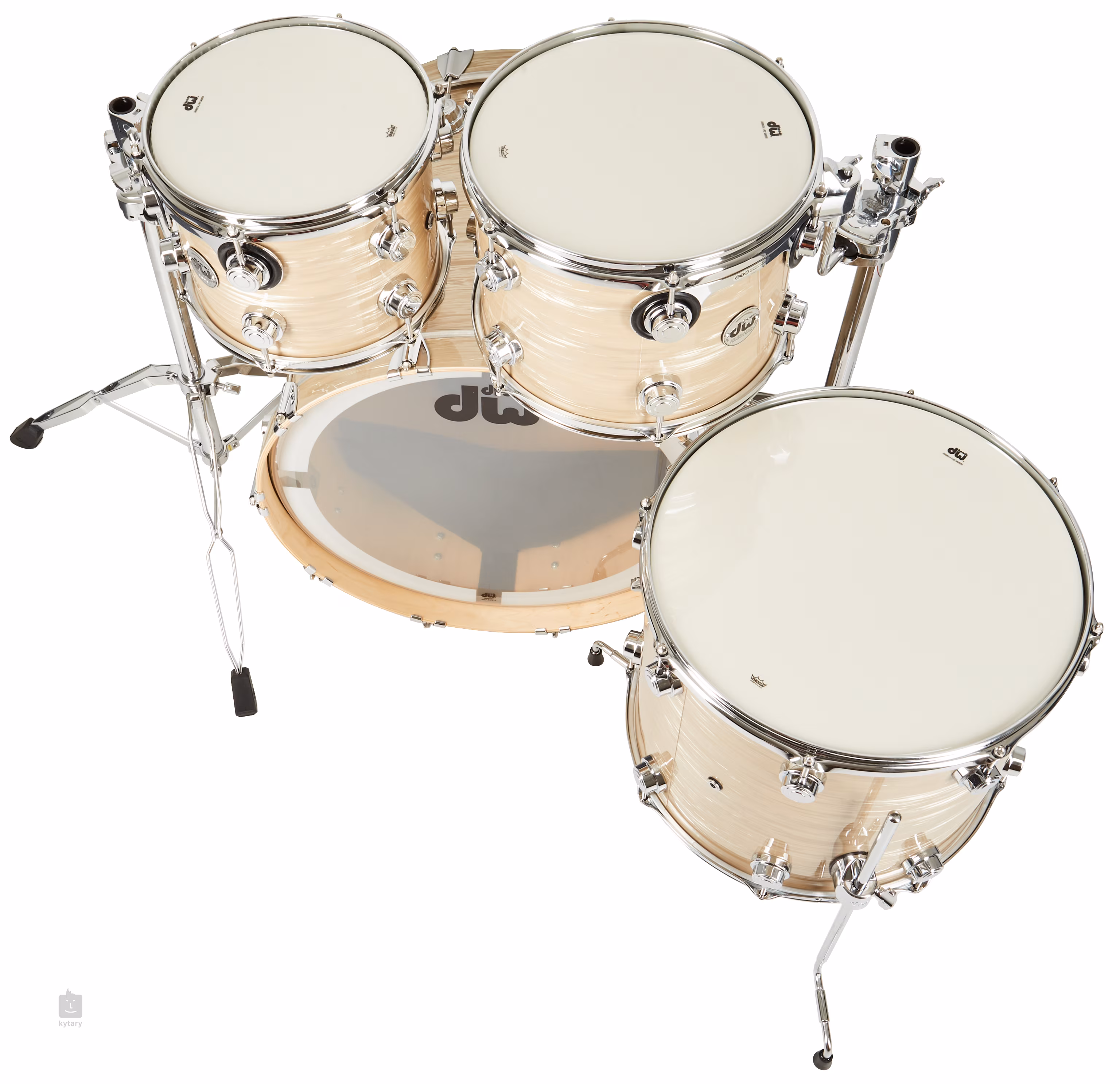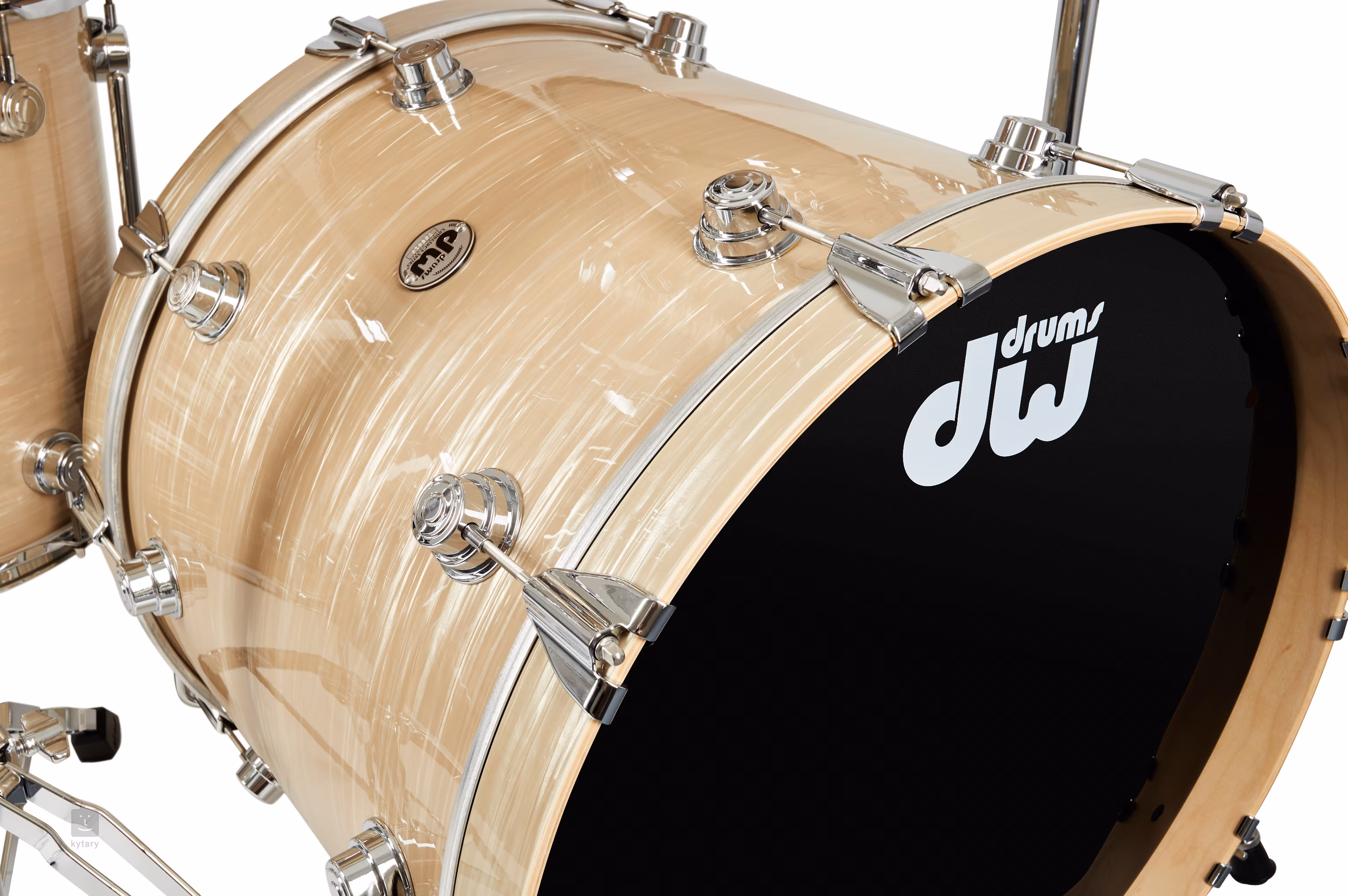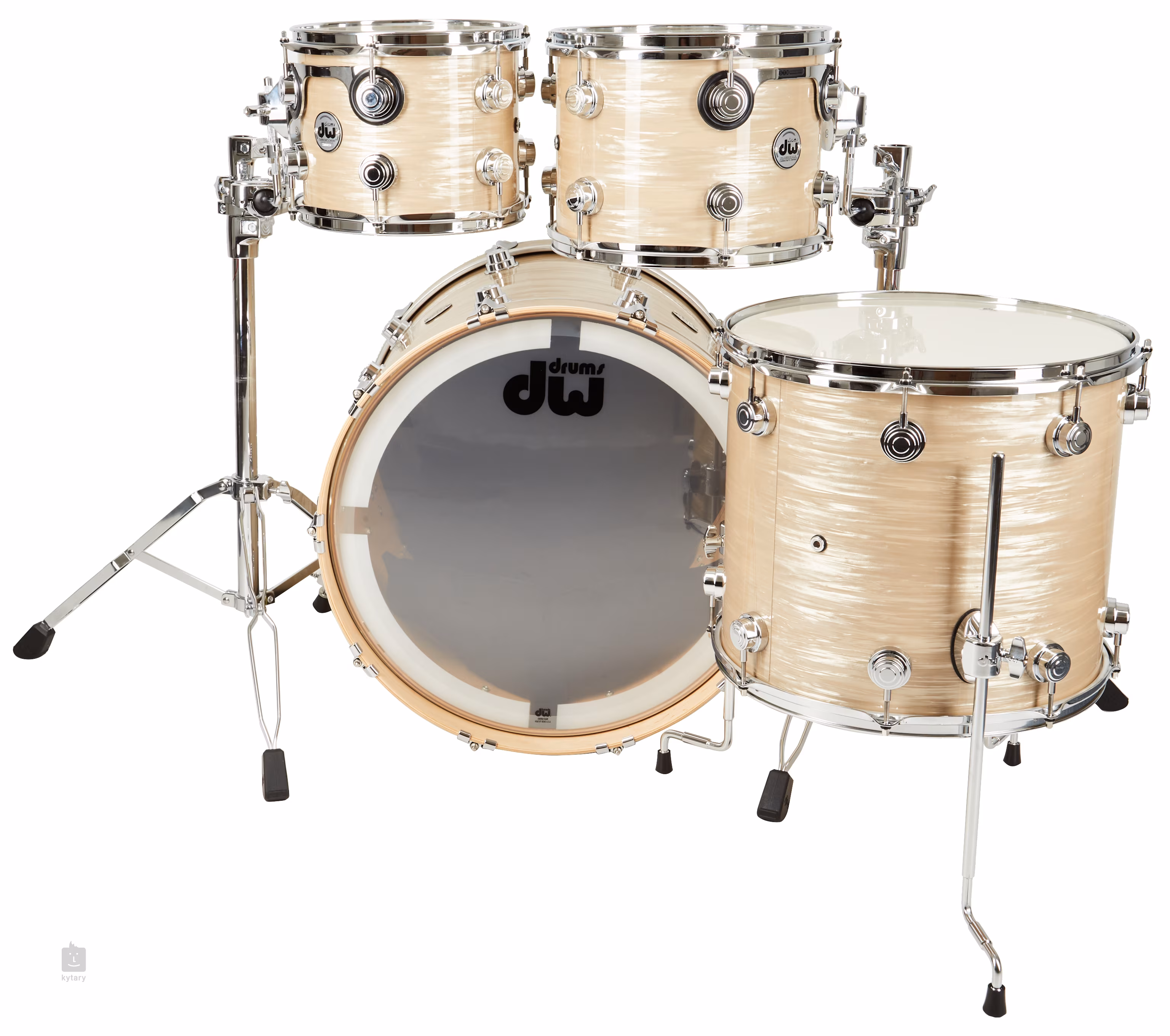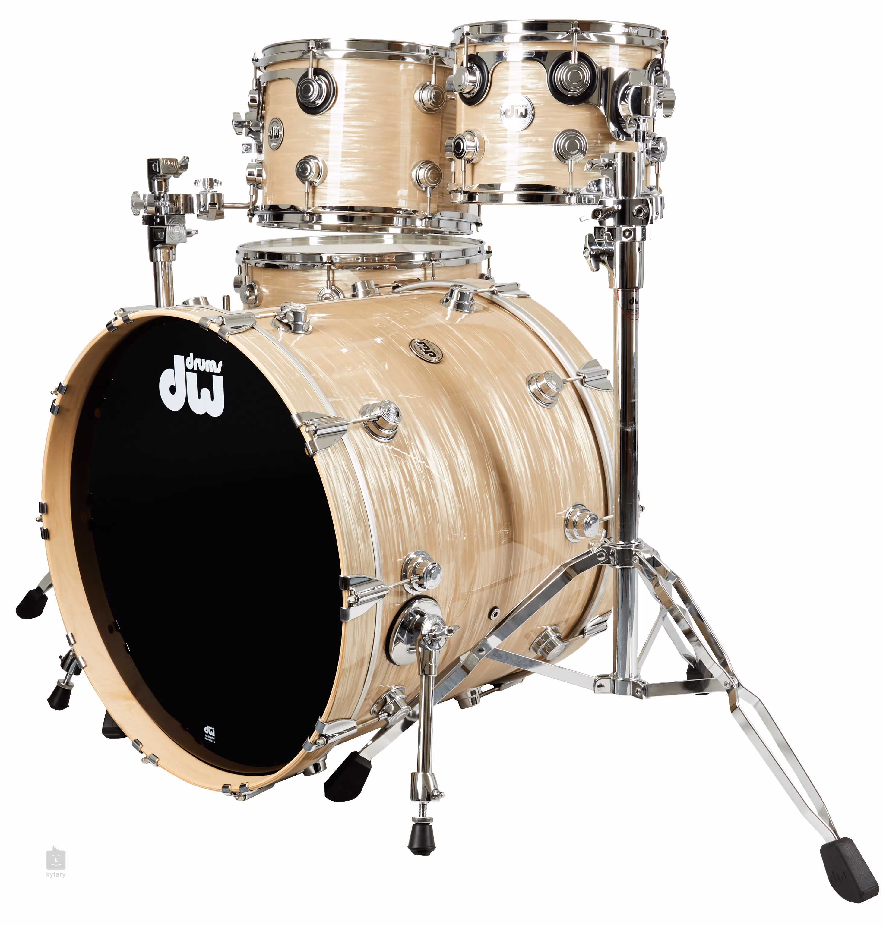 Dieses Schlagzeug der Collector's Series umfasst eine Bassdrum, zwei Toms und ein Floor Tom. Die Kessel des Sets sind komplett aus Ahorn gefertigt, das aufgrund seiner starken Resonanz und seines druckvollen Attacks sehr beliebt für den Bau von Drumsets ist. Die patentierte Suspension Tom Mount ermöglicht eine maximale Resonanz des Holzes und bietet gleichzeitig Stabilität und eine sichere Aufhängung. Stimmschrauben mit dichterer Gewindeschichtung (bis zu 20% mehr als bei Standardschrauben) ermöglichen eine maximale Kontrolle über den Klang des Kits. Das Handfinish ist eines der Merkmale, die DWs Namen ausmachen. In diesem Fall ist es das spezielle FinishPly-Finish in Créme Oyster. Die Hardware ist komplett verchromt.