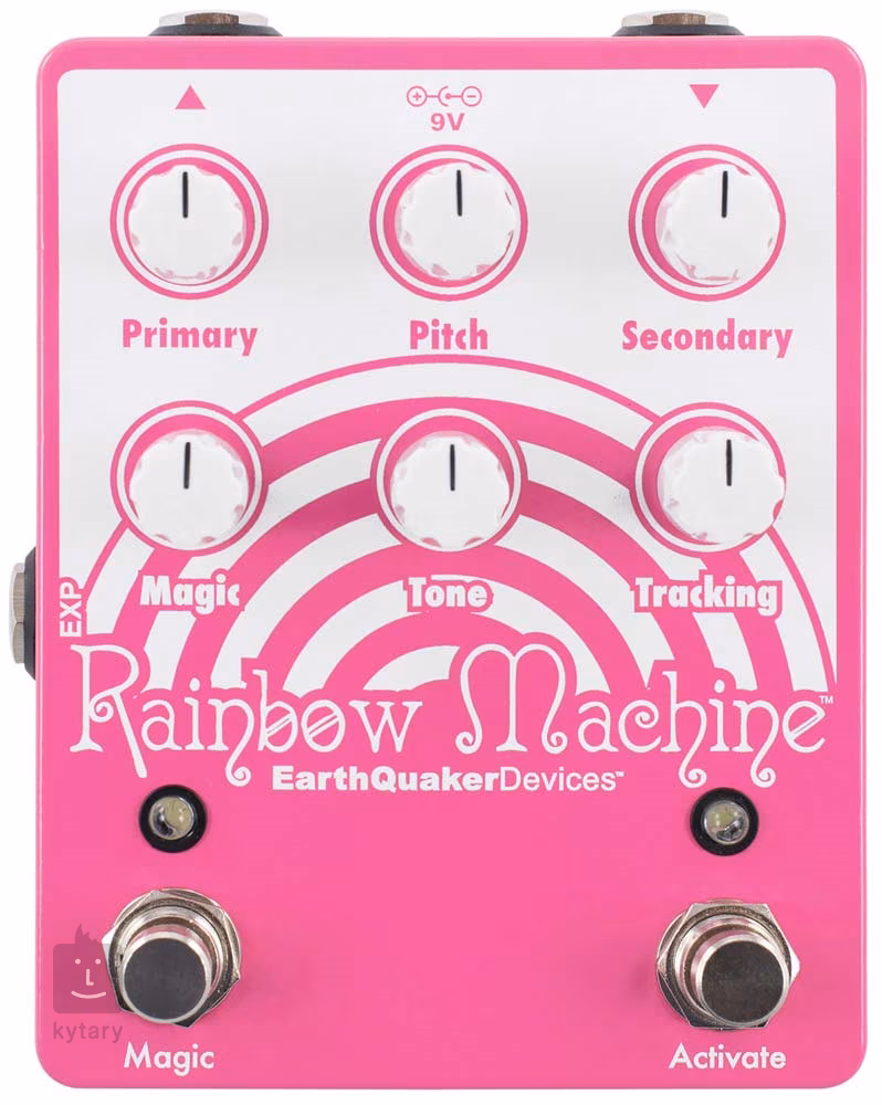 Die Einstellung des Pitch-Reglers bestimmt die Frequenz der polyphonen Harmonie (oder des Missklangs), und in der neutralen Einstellung bietet die Box den Klang eines Chorus-Effekts. Der Primary-Regler dient als Lautstärkeregler für die mehrstimmige Harmonie. Der Tracking-Regler bestimmt die Verzögerung zwischen dem trockenen und dem nassen Signal, der Tone-Regler ist ein EQ, der Secondary-Regler fügt der Grundharmonie einen Oktav-Effekt (nach unten und oben) hinzu, und mit dem Magic-Regler können Sie ausprobieren, wie magisch oder seltsam der Rainbow Machine-Effekt sein kann.