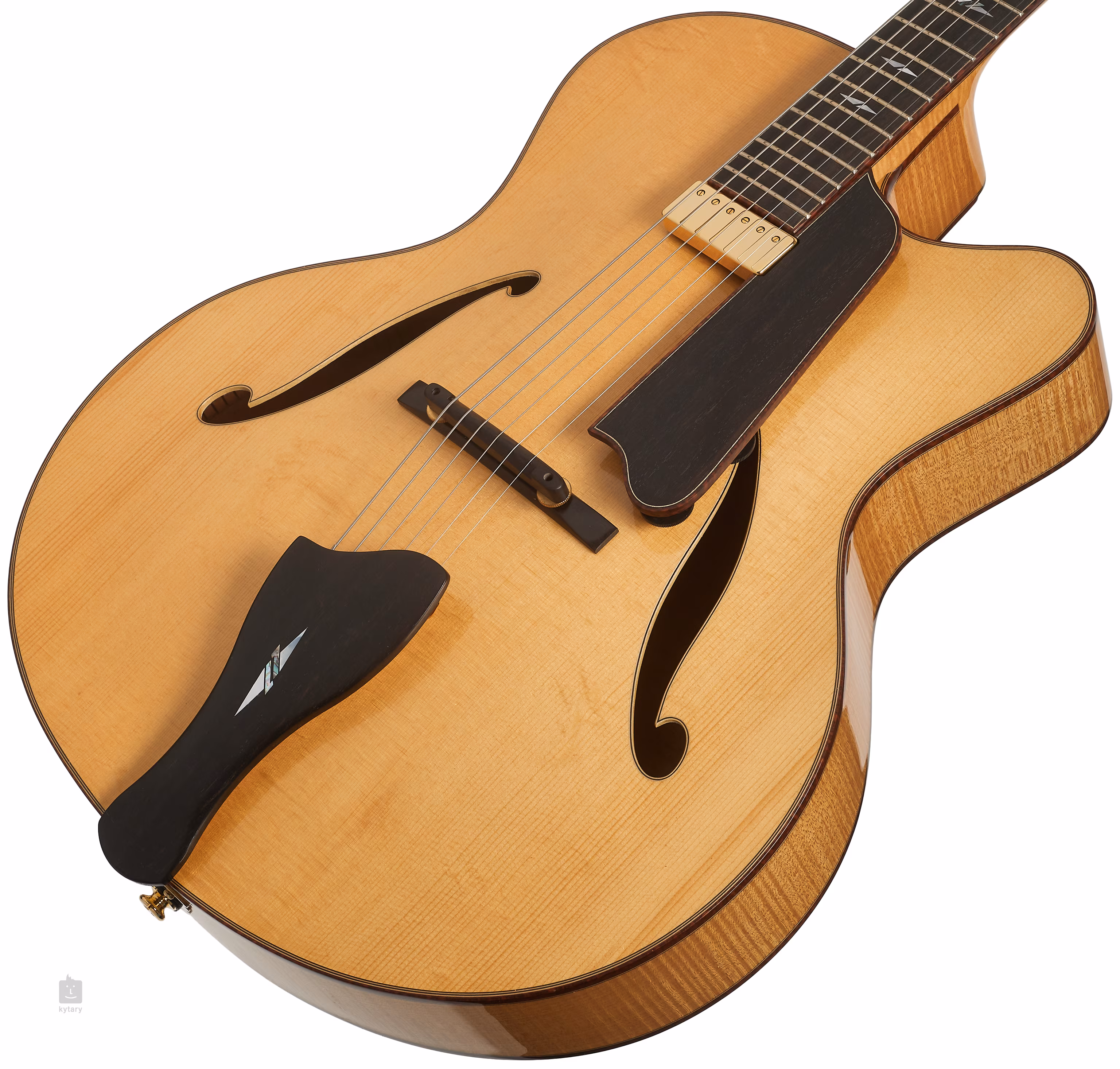Ein Lollar Floating Johnny Smith Halstonabnehmer bietet die Möglichkeit des Voicings. Der Klangcharakter kann über die am Schlagbrett angebrachten Drehknöpfe eingestellt werden. Die Saiten sind in Schaller E-M6Ga Mechaniken gelagert und durch ein verstellbares Ebenholzgriffbrett in den Saitenreitern (Ebenholz/Messing). Die schöne Verarbeitung wird durch die glänzende Korpuslackierung (Truetone Gloss), doppelseitige Ahornzierleisten an Korpus, Griffbrett, Kopfplatte und F-Löchern, Ebenholz-Schlagbrett mit exklusiver Schlangenholzzierleiste, goldene Hardware und Perlmuttmotiv und Firmenlogo auf der Kopfplatte unterstrichen.