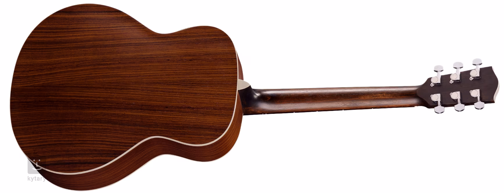 Die Decke der Gitarre besteht aus thermisch gehärteter Sitka-Fichte, während Boden und Zargen aus laminiertem Palisanderholz gefertigt sind. Ein Palisandergriffbrett mit 20 Bünden ist auf einen Okoumé-Hals mit schönem C-Profil geleimt. Die Resonanz der Decke wird durch traditionelle X-Rippen unterstützt, und die Orientierung auf dem Griffbrett wird durch Perlmutt-Positionspunkte erleichtert.