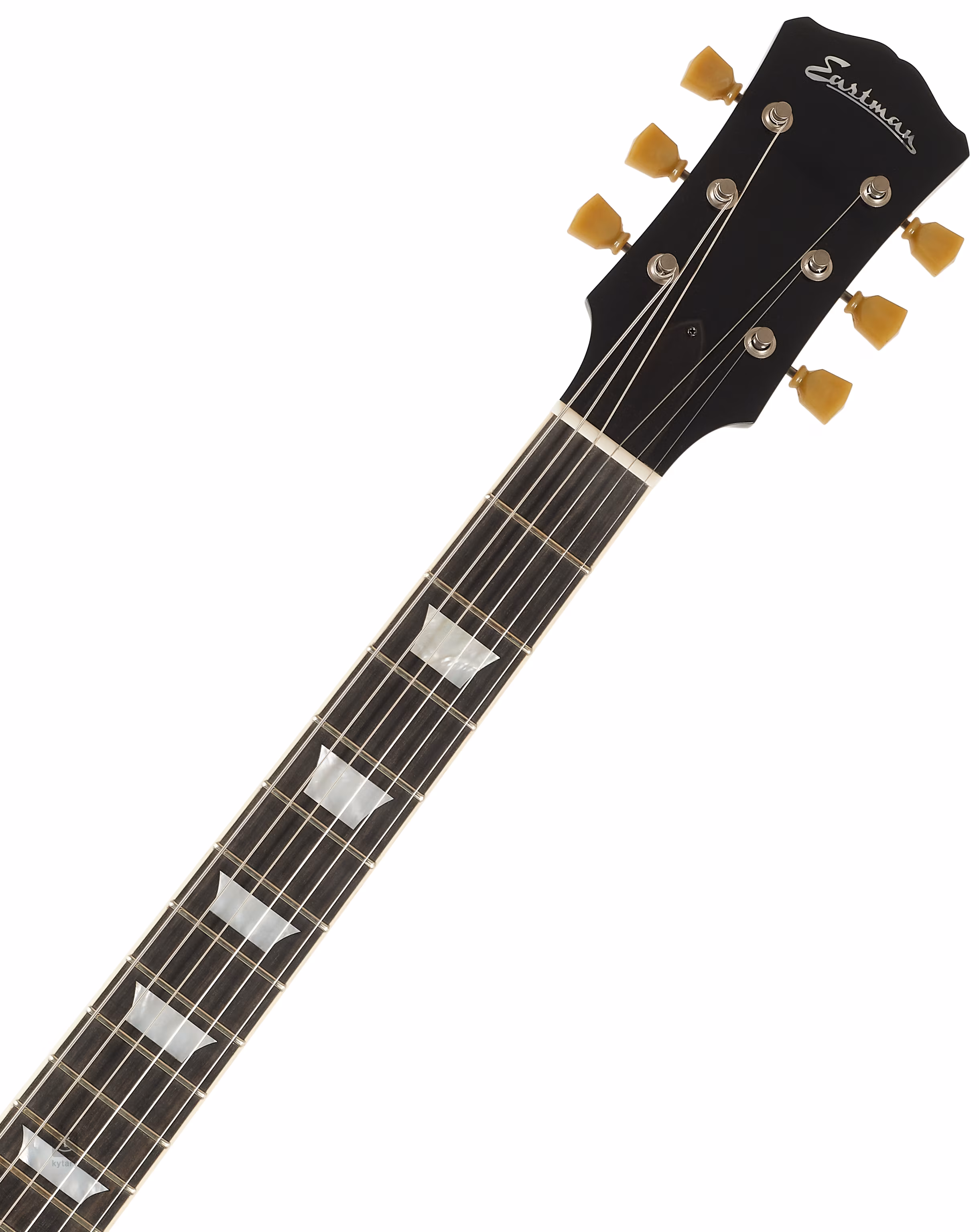 Die Eastman SB59/TV-BK ist eine E-Gitarre im Single-Cut "LP"-Design. Der Mahagonikorpus der Gitarre ist mit einer massiven Ahorndecke verziert. Die Maserung des Holzes wird durch eine glänzende Lackierung des Korpus mit einem subtilen Hauch von Patina (Truetone Vintage Gloss) und einem Vintage Black Finish hervorgehoben. Der einteilige Mahagoni-Hals ist mit einem Ebenholz-Griffbrett mit zweiundzwanzig Bünden verleimt. Die Orientierung auf dem Griffbrett wird durch Positionsblöcke aus Perlmutt (Pearl Crowns) erleichtert.