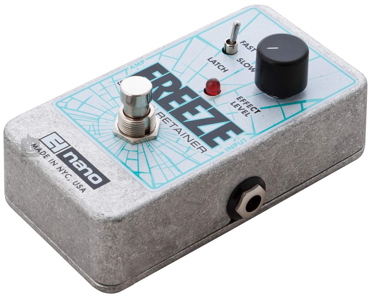EHX Freeze ist im Grunde eine "gerippte" und in einer separaten Box untergebrachte Freeze-Funktion des bekannten HOG-Effekts von Electro Harmonix. Als Sound Retainer kann er (bei gedrücktem Taster) der gerade gespielten Note oder dem gerade gespielten Akkord unendliches Sustain hinzufügen, über das man dann improvisieren kann. Durch Drücken des Schalters und erneutes Drücken und Halten des Schalters können Sie sofort eine zusätzliche Klangbasis/-fläche auflegen.