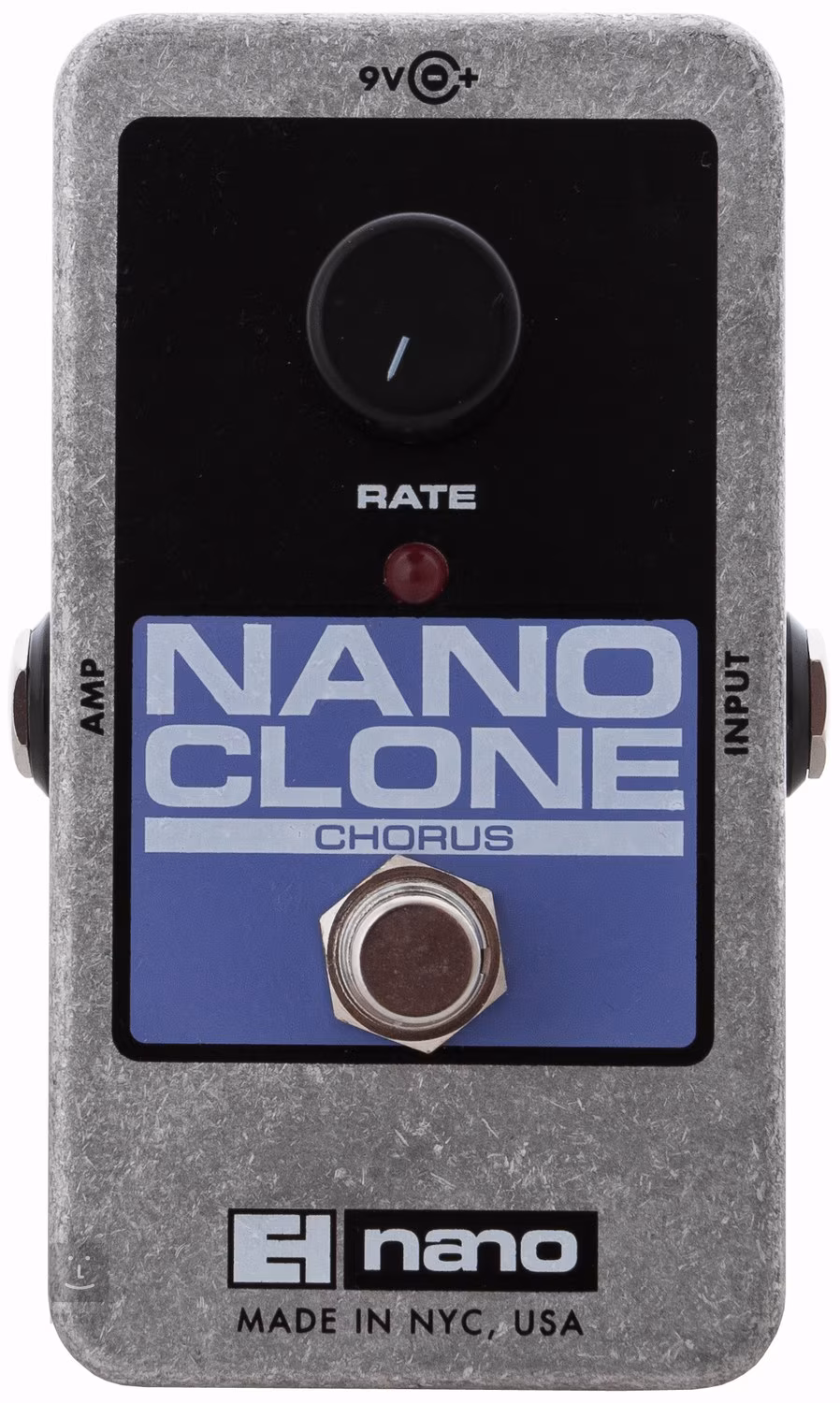 Der EHX Nano Clone ist ein klassischer Analog-Chorus in minimalistischem Design, der Ihnen traditionelle Chorus-Effekte bietet, d. h. einen warmen, vollen Klang mit einem sanften Klangflimmern (Verdopplung der Gitarrenlinien) sowie eine deutlichere „Seasick“-Modulation mit metallischerem Klang. Mit dem einzigen Regler des Pedals bestimmen Sie die Geschwindigkeit der Effektmodulation. Nichts für „Tweaker“, aber wenn Sie einen maximal einfachen, praktischen und zuverlässigen Chorus in klassischer Form suchen, dann ist er sicherlich eine gute Wahl. Die gesamte Elektronik des Pedals ist in einem robusten Metallgehäuse untergebracht. Das Gerät arbeitet im True-Bypass-Modus, sodass es im ausgeschalteten Zustand das durchlaufende Signal in keiner Weise beeinflusst. Die Stromversorgung erfolgt über eine 9-V-Batterie oder einen 9-V-Adapter.