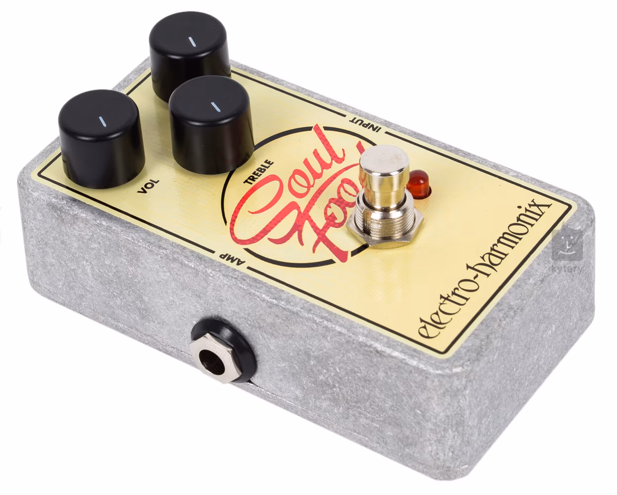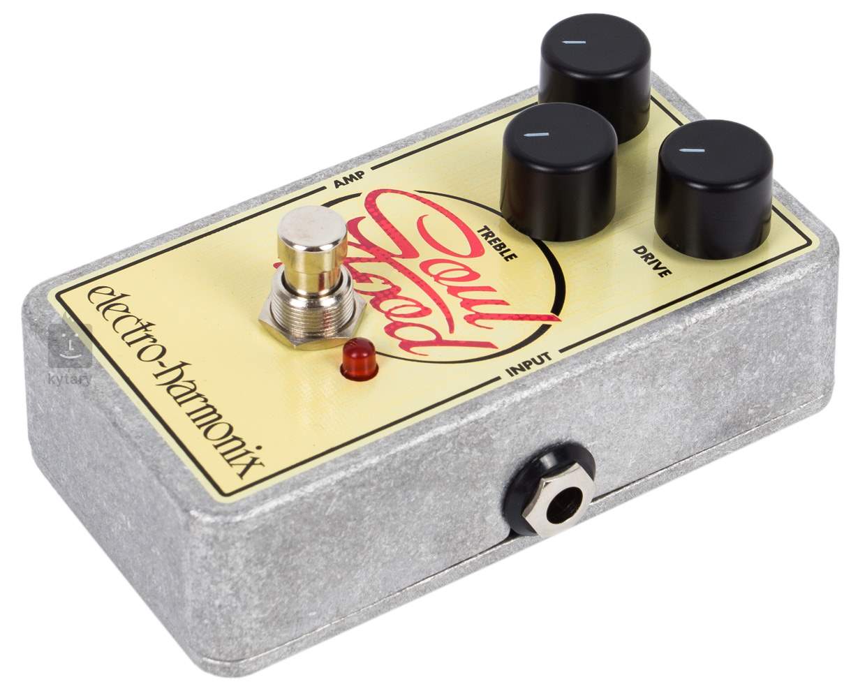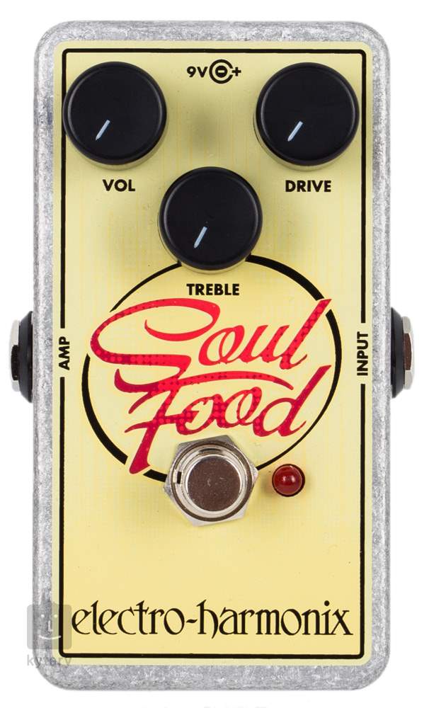 EHX Soul Food ist ein transparenter Overdrive-Effekt mit großer Empfindlichkeit und Dynamik für alle Spieler, die ihren Gitarrensound "aufpeppen" wollen, aber den natürlichen Klang der Gitarrentonabnehmer und des Instruments nicht verändern wollen. Dieser Effekt gehört zu einer Reihe von Pedaleffekten, die von der in den 90er Jahren produzierten Klon Centaur Box inspiriert wurden. Es bietet einen warmen cleanen Boost (Lautstärkeanhebung), etwas bluesigen Schmutz und einen vollen, saftigen Rock-Overdrive. Drei Regler bestimmen die Ausgangslautstärke des Pedals, den Grad der Verzerrung/Overdrive und den EQ.