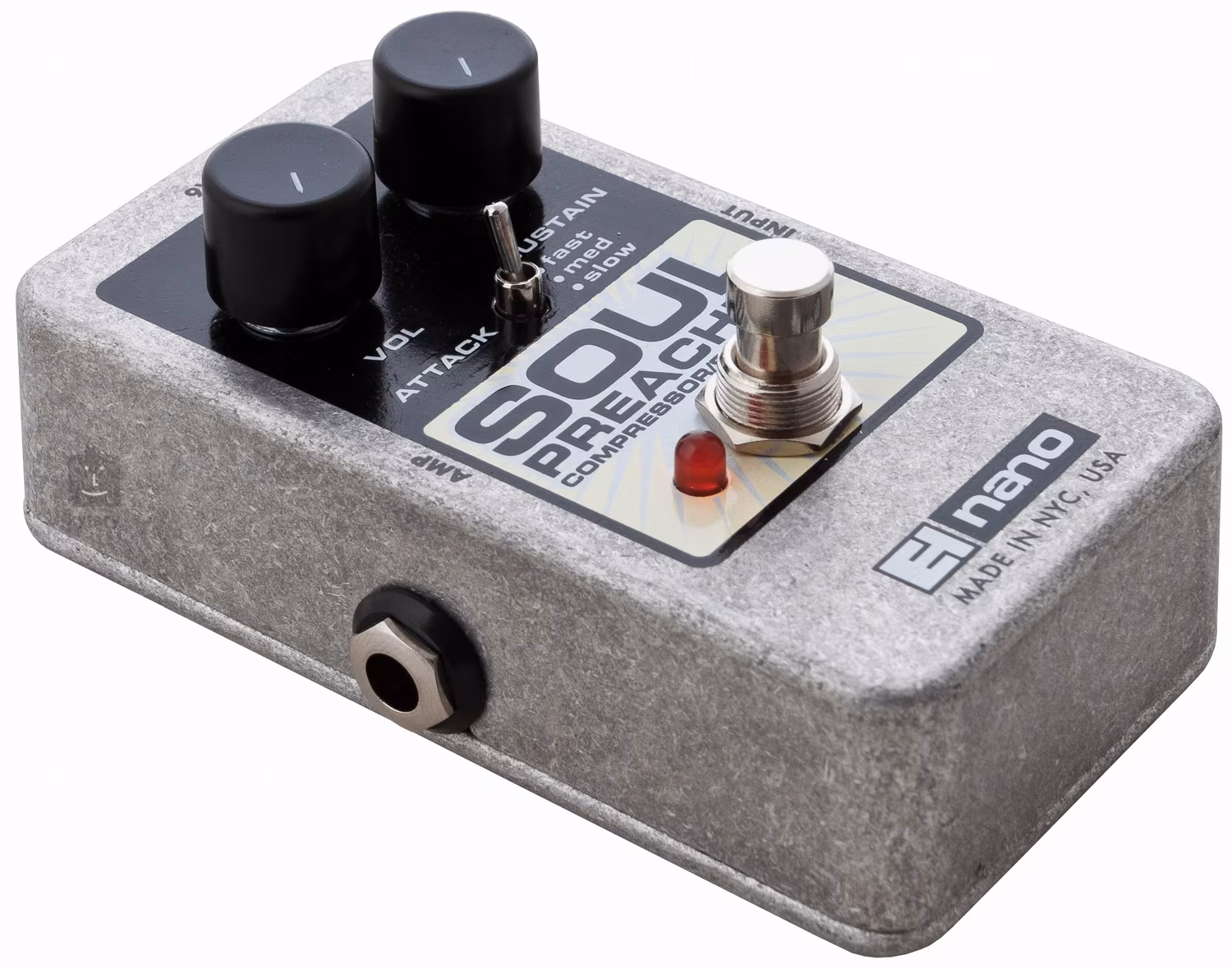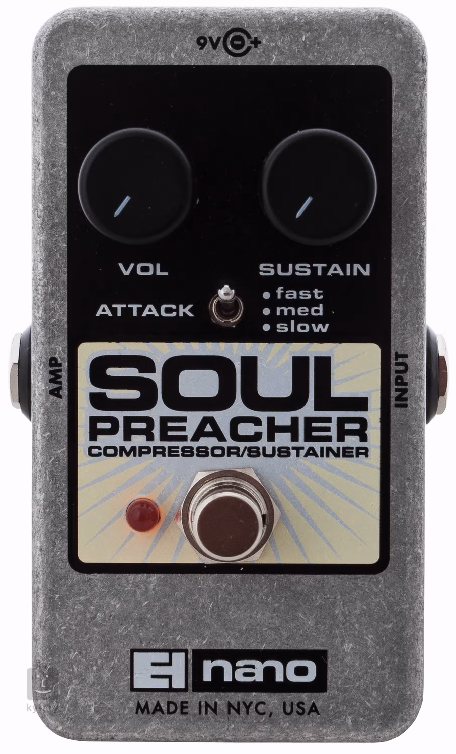 Der EHX Soul Preacher ist ein Kompressor/Sustainer für Gitarre oder Bass, der Ihnen hilft, die Dynamik Ihres Spiels zu nivellieren und Ihrer Gitarre ein schön singendes Sustain zu verleihen. Viele werden mit dem einfachen Design der Regler zufrieden sein, bei denen die Einstellungen die Ausgangslautstärke, die Stärke der Kompression/Sustain und die Geschwindigkeit des Einsetzens des Kompressionseffekts in 20-, 50- und 100-Millisekunden-Intervallen bestimmen (Attack-Schalter mit drei Positionen). Die Eingangsparameter machen den Soul Preacher für alle Arten von Tonabnehmern (Singlecoils und Humbucker) geeignet.