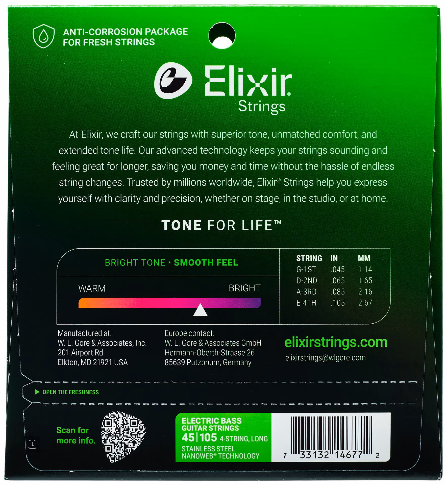 Elixir-Saiten sind bekannt für ihre extrem lange Lebensdauer, mit der sie nur schwer konkurrieren können. Dank einer speziellen Beschichtung sind sie korrosions-, feuchtigkeits-, schmutz- und schweißbeständig, sodass sie lange einen klaren und durchdringenden Ton behalten. In diesem Satz finden Sie Saiten, die mit rostfreiem Stahl umsponnen sind, was ihnen einen klangvolleren Ton mit druckvollem Bass verleiht. Sie sind mit einer schützenden Nanoweb-Beschichtung versehen, die sie extrem haltbar und glatter als herkömmliche Saiten macht und das Geräusch reduziert, das entsteht, wenn man mit den Fingern über die Saite fährt.
