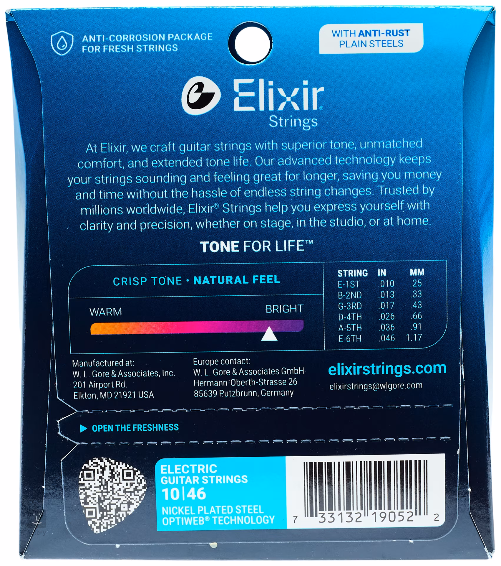 Elixir-Saiten sind bekannt für ihre extrem lange Lebensdauer, die kaum zu übertreffen ist. Dank ihrer speziellen Beschichtung sind sie korrosions-, feuchtigkeits-, schmutz- und schweißbeständig, sodass sie lange Zeit einen klaren und durchdringenden Klang behalten. Klanglich handelt es sich um sehr starke Saiten aus vernickeltem Stahl, die ordentlich Biss und Charakter haben. Dieses Set ist mit der neuesten Schutzschicht von Elixir namens Optiweb beschichtet, die so dünn ist, dass sie von unbeschichteten Saiten nicht zu unterscheiden ist. Es ist daher ideal für alle, die die Vorteile beschichteter Saiten nutzen möchten, aber keine Kompromisse beim Klang eingehen wollen.