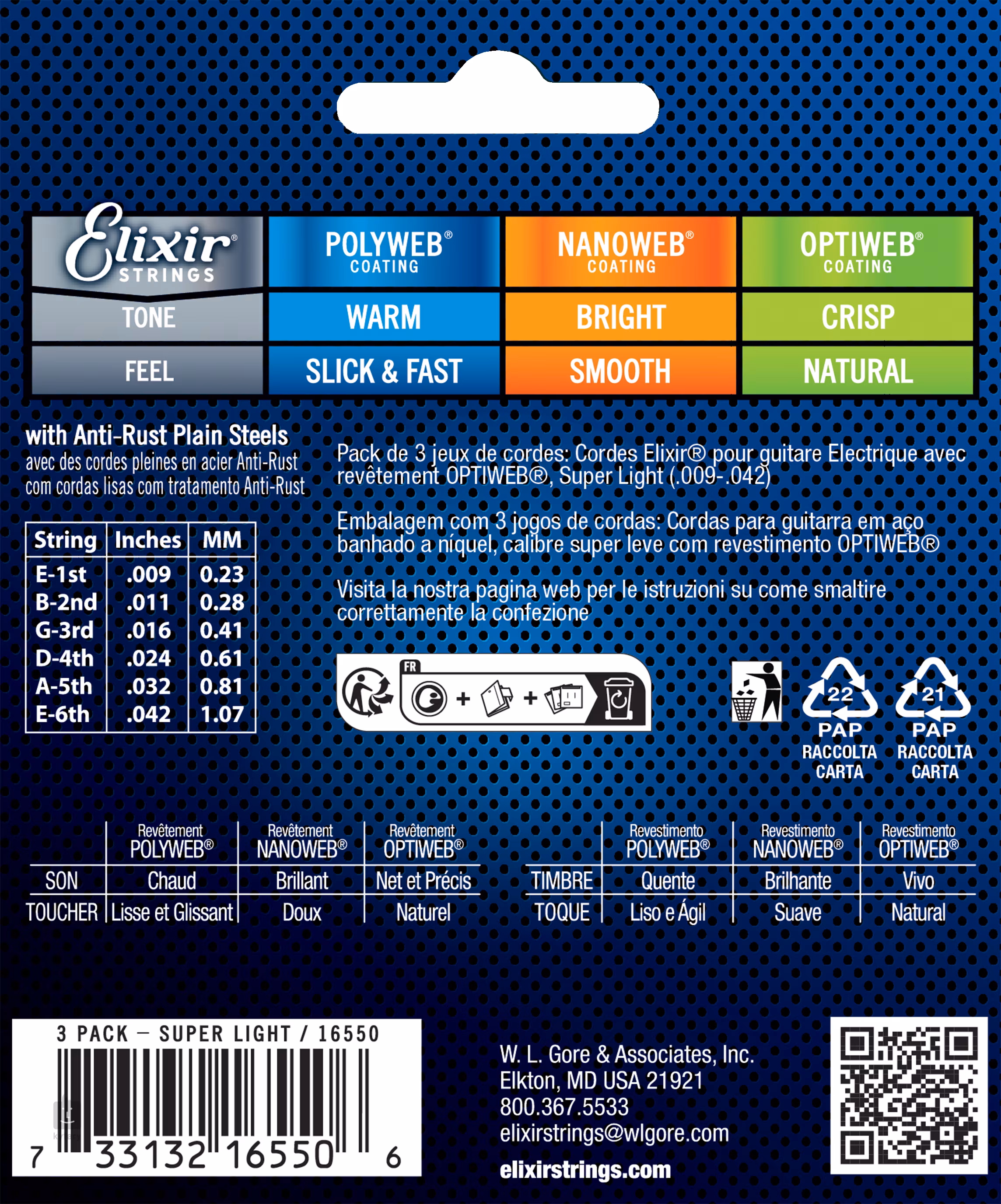 Elixir-Saiten sind bekannt für ihre extrem lange Lebensdauer, die kaum zu übertreffen ist. Dank ihrer speziellen Beschichtung sind sie korrosions-, feuchtigkeits-, schmutz- und schweißbeständig, sodass sie lange Zeit einen klaren und durchdringenden Klang behalten. Klanglich handelt es sich um sehr kräftige Saiten aus vernickeltem Stahl, die ordentlich Biss und Charakter haben. Dieses Set ist mit der neuesten Schutzschicht von Elixir namens Optiweb beschichtet, die so dünn ist, dass sie von unbeschichteten Saiten nicht zu unterscheiden ist. Er ist daher ideal für alle, die von den Vorteilen beschichteter Saiten profitieren möchten, aber keine Kompromisse beim Klang eingehen wollen.