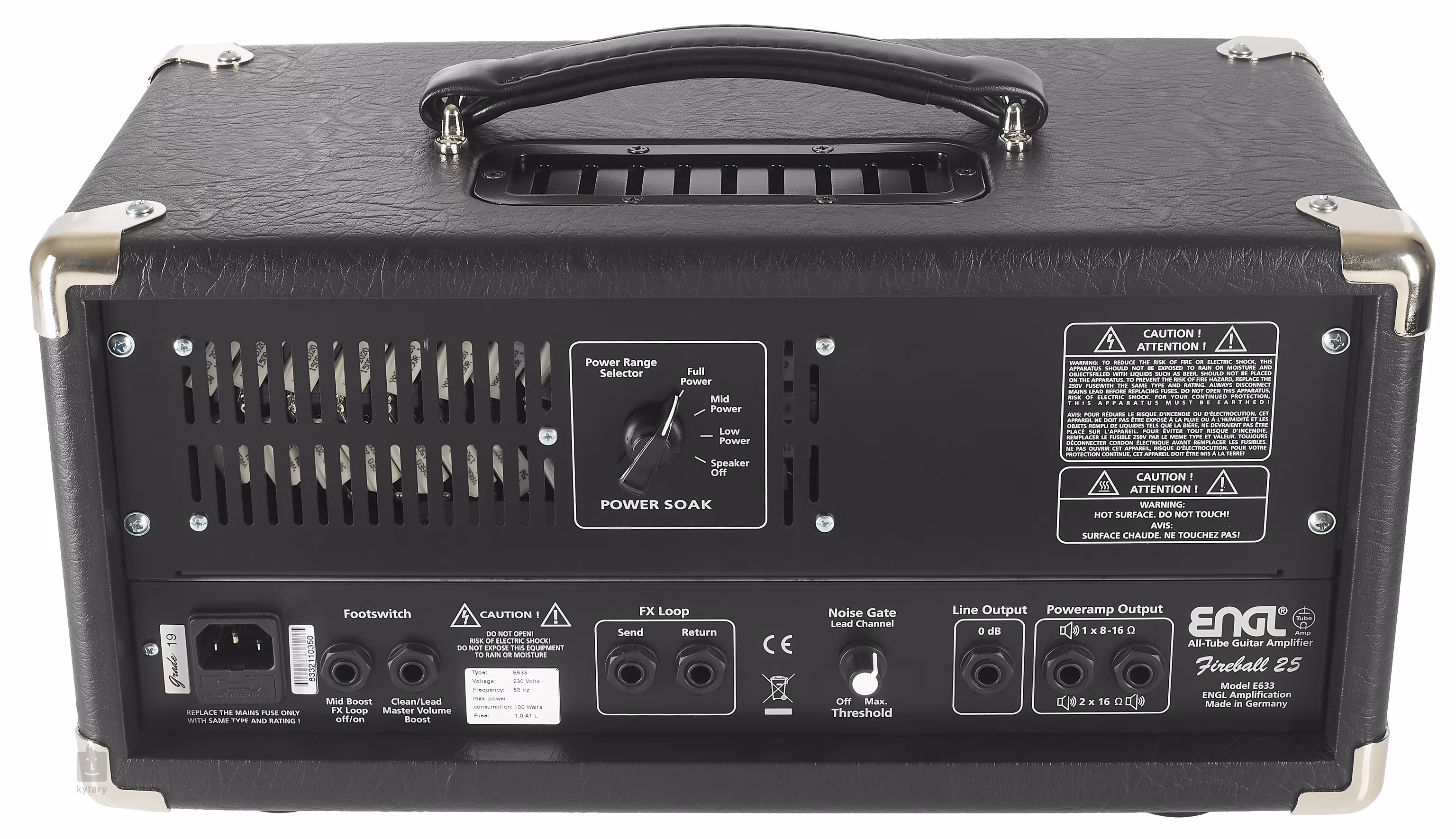 Der FIREBALL 25 E633 ist ein zweikanaliger Verstärker, der (wie alle Fireball-Modelle) mit übersichtlichen Bedienelementen überzeugt. Die Klangpalette des ersten Kanals (Clean) beginnt mit einem klaren, reinen Klang und endet mit einem rockigeren Crunch. Der zweite Kanal (Lead) knüpft dort an, wo der Clean-Kanal endet, und reicht bis in den Bereich des Metal-Ultra-Hi-Gain. Viele werden sicherlich auch die Möglichkeit der Klangdämpfung dank des Power-Soak-Reglers auf der Rückseite zu schätzen wissen, mit dem Sie die Leistung des Verstärkers auf bis zu 1 W reduzieren können. So können Sie den großartigen „geschmolzenen” Klang des Verstärkers auch bei Zimmerlautstärke genießen (die Power-Soak-Funktion funktioniert nur bei Anschluss einer externen Lautsprecherbox über 8 Ohm).
