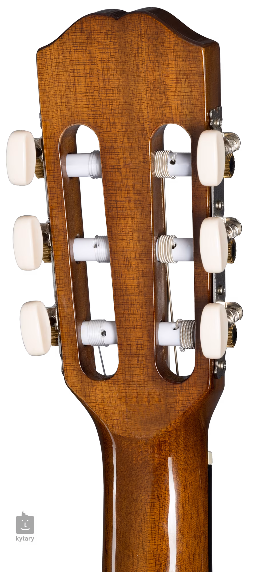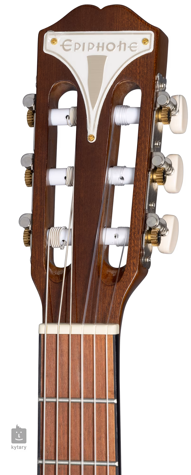 Die Epiphone Classical E1 Full Size ist ein erschwingliches Instrument, das sich für Anfänger eignet. Es verfügt über einen Korpus aus laminierter Zedernfront und laminiertem Mahagoni-Boden und -Zargen. Der Mahagoni-Hals mit "EZ-Profile D"-Profil ist auf ein mit neunzehn Bünden versehenes Feigengriffbrett geleimt. Die Saiten sind über die Graphtech NuBone Null- und Sattelbünde in Epiphone Deluxe Classical Mechaniken mit 16:1 Übersetzung und Feigenholzgriffbrett verankert. Die stilvolle Verarbeitung wird durch die traditionell verzierte Rosette und das elfenbeinfarbene Perimeter-Binding mit schwarzen Linien akzentuiert.