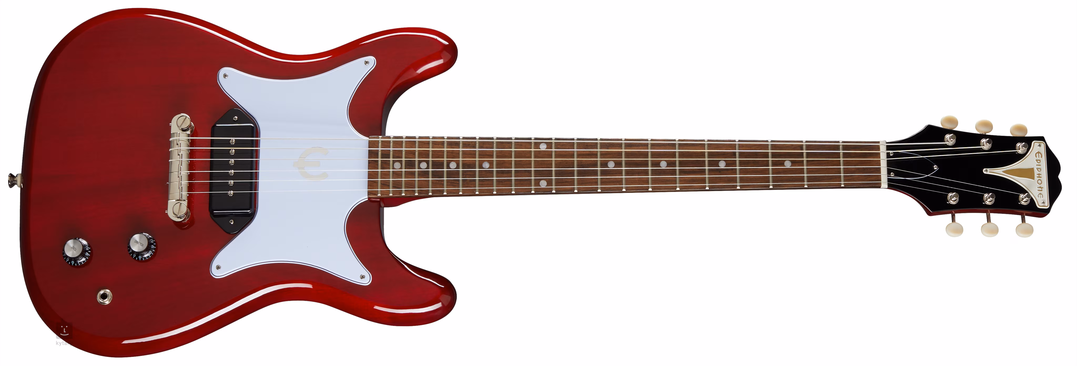 Die P-90-Tonabnehmer im Dogear-Design verleihen der Gitarre einen durchdringenden, aber dennoch warmen Sound, der sich für eine Vielzahl von Musikstilen eignet - von Jazz und Blues bis hin zu Classic Rock und Punk. Der Charakter des Tons kann mit dem Volume-Potentiometer und der Tonblende eingestellt werden. Die Saiten sind in den firmeneigenen Stimmmechaniken mit Wirbeln aus Elfenbeinimitation und Wrap-Around-Steg über dem NuBone-Griffbrett verankert. Das originelle Design des Instruments wird durch das Butterfly-Pickguard und Epiphones verkleinerte Kopfplatte unterstrichen.