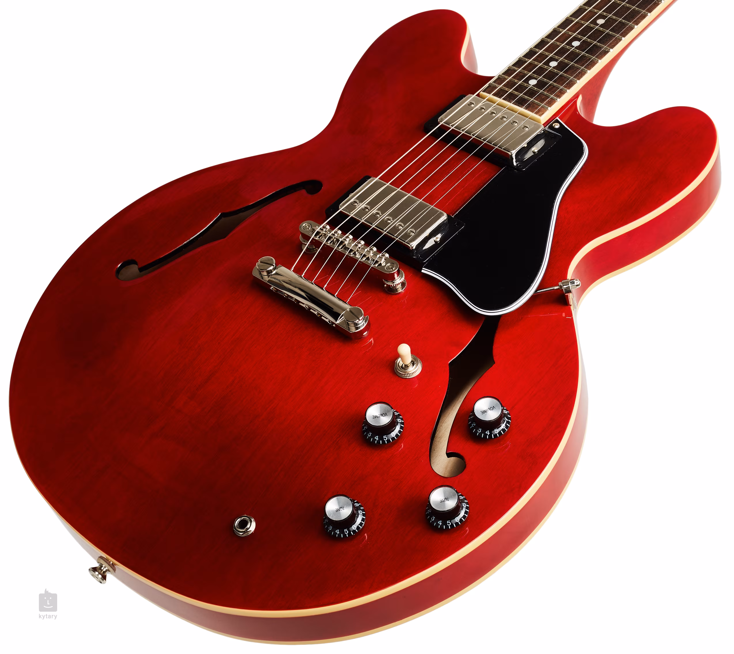 Epiphone ES-335 Semi-Hollowbody E-Gitarren sind günstigere Kopien der 1958 eingeführten Gibson ES-335 Gitarren. Der Korpus des ES-335 Cherry Modells besteht aus Sperrholz und einem massiven Ahorn-Mittelblock. Auf den Mahagonihals ist ein Feigengriffbrett mit zweiundzwanzig Medium-Jumbo-Bünden geleimt. Positionsblöcke (Trapezoid) erleichtern die Orientierung auf der Griffbrettoberfläche.
