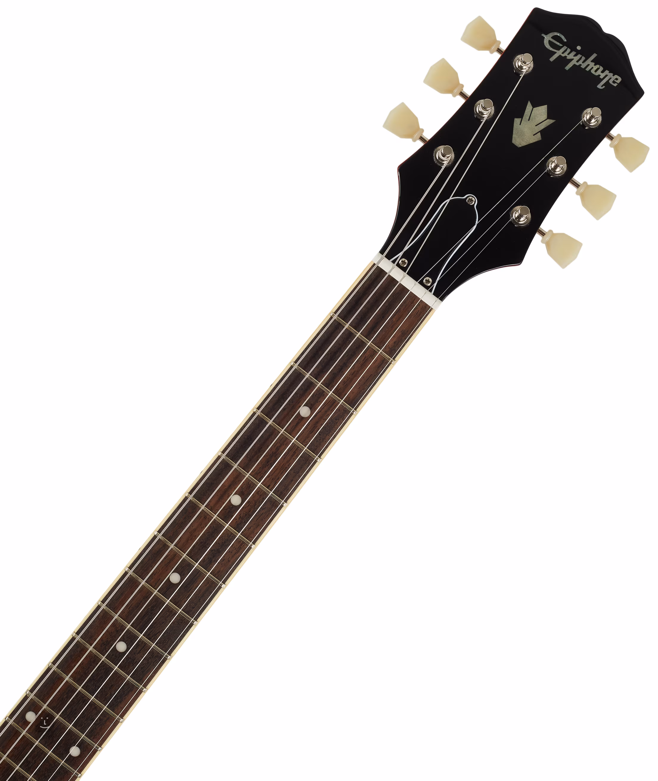 Zwei proprietäre Humbucker mit Alnico V-Magneten verleihen der Gitarre einen warmen, artikulierten Sound und den nötigen Rock-Drive. Der Klangcharakter lässt sich mit zwei Volume-Potentiometern, zwei Tone-Reglern und einem dreistufigen Pickup-Schalter formen. Die Saiten werden in den hauseigenen Stimmmechaniken und über einen LockTone Tune-O-Matic Saitenstopbar gespannt. Die schöne Verarbeitung wird durch die cremefarbene Umrandung des Korpus, die Nickel-Hardware und das schwarze fünflagige Schlagbrett unterstrichen.