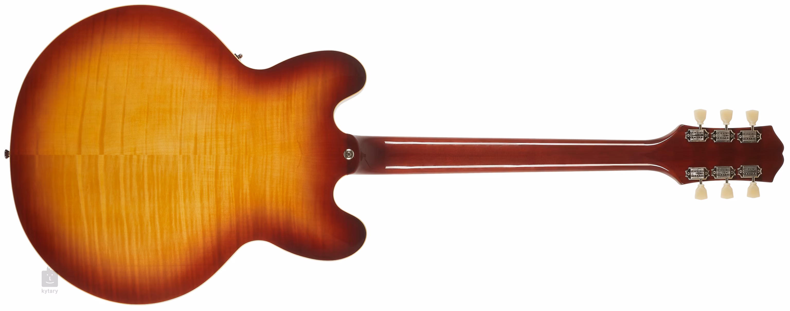 Das Modell ES-335 Figured Raspberry Tea Burst fällt auf den ersten Blick durch seine spektakuläre Schichtung aus laminiertem Ahorn auf, die durch die Korpusfärbung akzentuiert wird. Auf den Mahagoni-Hals ist ein Feigenholz-Griffbrett geklebt, das mit zweiundzwanzig Medium-Jumbo-Bünden bestückt ist. Die Orientierung auf der Oberfläche des Griffbretts wird durch Positionsblöcke (Trapezoid) erleichtert.