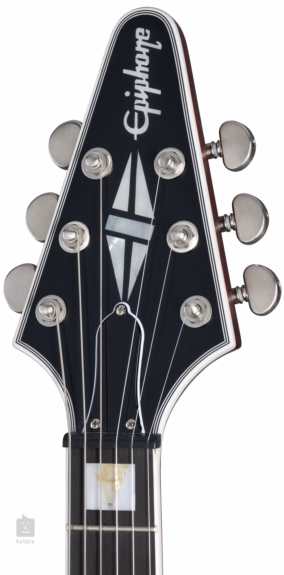 Der Mahagonikorpus der Flying V Prophecy Aged Bengal Tiger Burst ist mit einem spektakulären AAA-Qualitätsfurnier aus geflammtem Ahorn verziert. Das asymmetrische Slim Taper-Profil des Mahagoni-Halses bietet der linken Hand den nötigen Komfort, um sich leicht und schnell auf dem Griffbrett zu bewegen. Das Ebenholz-Griffbrett selbst ist mit vierundzwanzig Jumbo-Bünden ausgestattet. Die Orientierung auf dem Griffbrett wird durch Positionsblöcke mit eingelassenen Stücken aus echtem Perlmutt (Abalone) erleichtert.