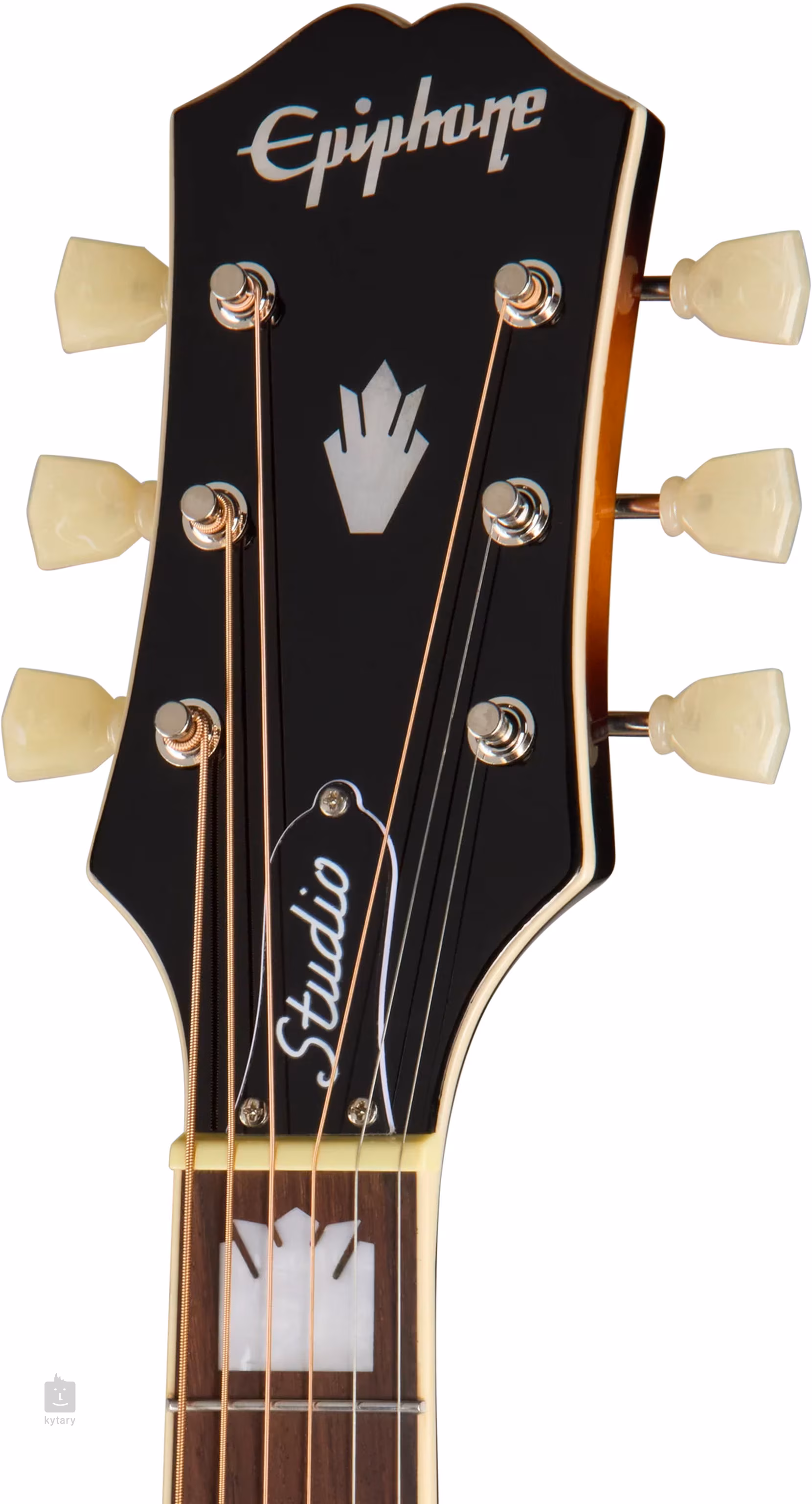 Die Saiten sind in Epiphone Deluxe-Stimmmechaniken mit Keystone-Stimmwirbeln und einem Palisander-Steg verankert. Die schöne Verarbeitung wird durch die Einfassung des Korpus, des Kopfes und des Griffbretts, einem Pickguard aus Imitationsschildpatt mit stilvollen Grafiken der J-200-Modelle, einer „Moustache”-Intarsie am Steg, dekorativen Positionsmarkierungen aus Imitationsperlmutt (Graduated Crown) und einem Perlmutt-Firmenlogo sowie einem Gibson Crown-Inlay auf dem Kopf des Instruments (Mother-of-Pearl).