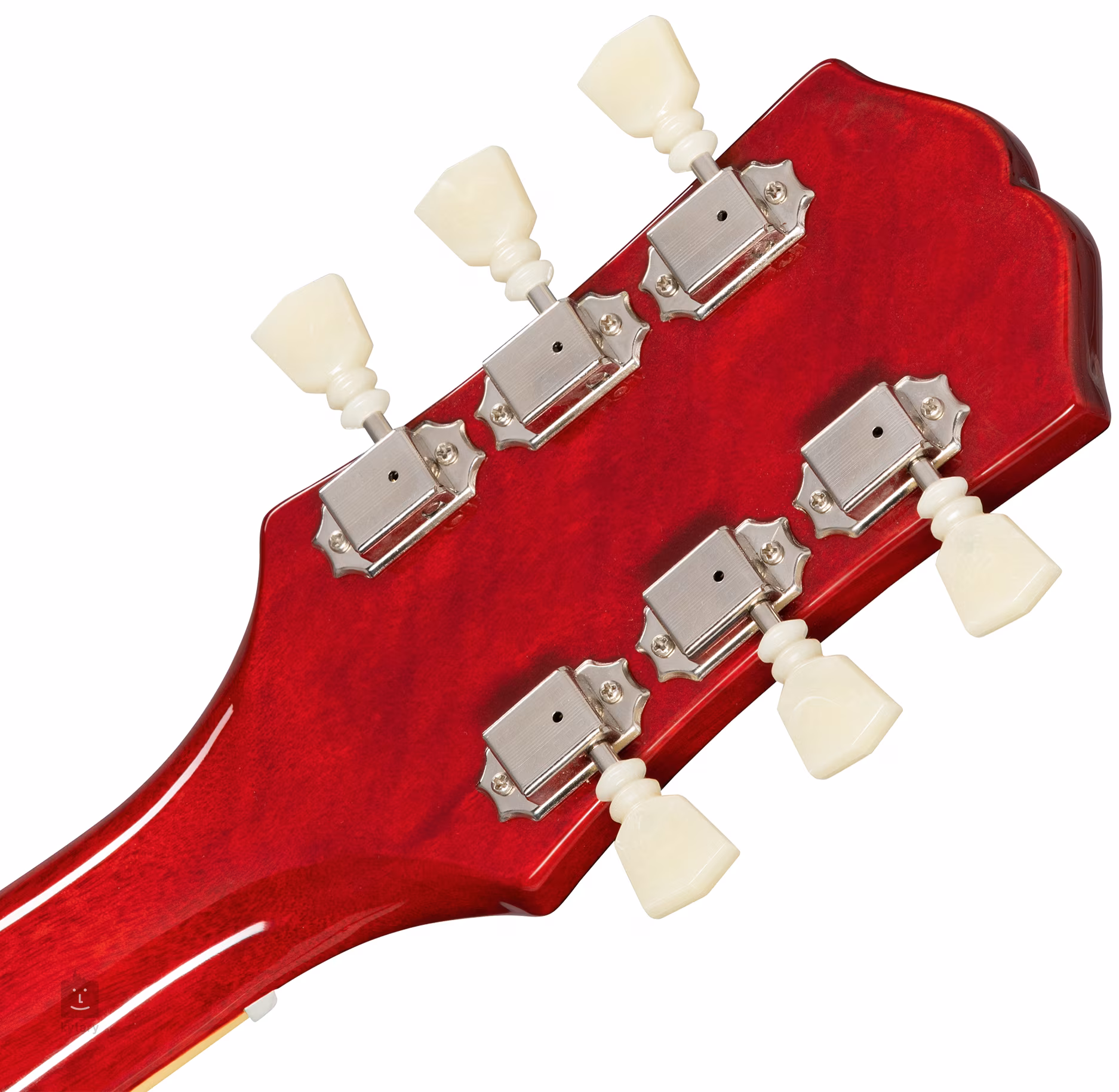 Für die Intonation des Instruments sorgen die von Gibson bevorzugten Burstbucker-Humbucker, d.h. Burstbucker 2 an der Halsposition und Burstbucker 3 am Saitenhalter, die mit CTS-Potentiometern und Mallory-Kondensatoren verlötet sind. Das macht die Gitarre komplett "ready to rock". Die Saiten sind in Epiphone Deluxe Mechaniken montiert und durch das LockTone TOM Griffbrett in ein stylisches Maestro Vibrola Tremolo. Die schöne Verarbeitung wird durch das cremefarbene Korpus- und Griffbrettbinding, das schwarze fünflagige Schlagbrett und die Nickel-Hardware unterstrichen.