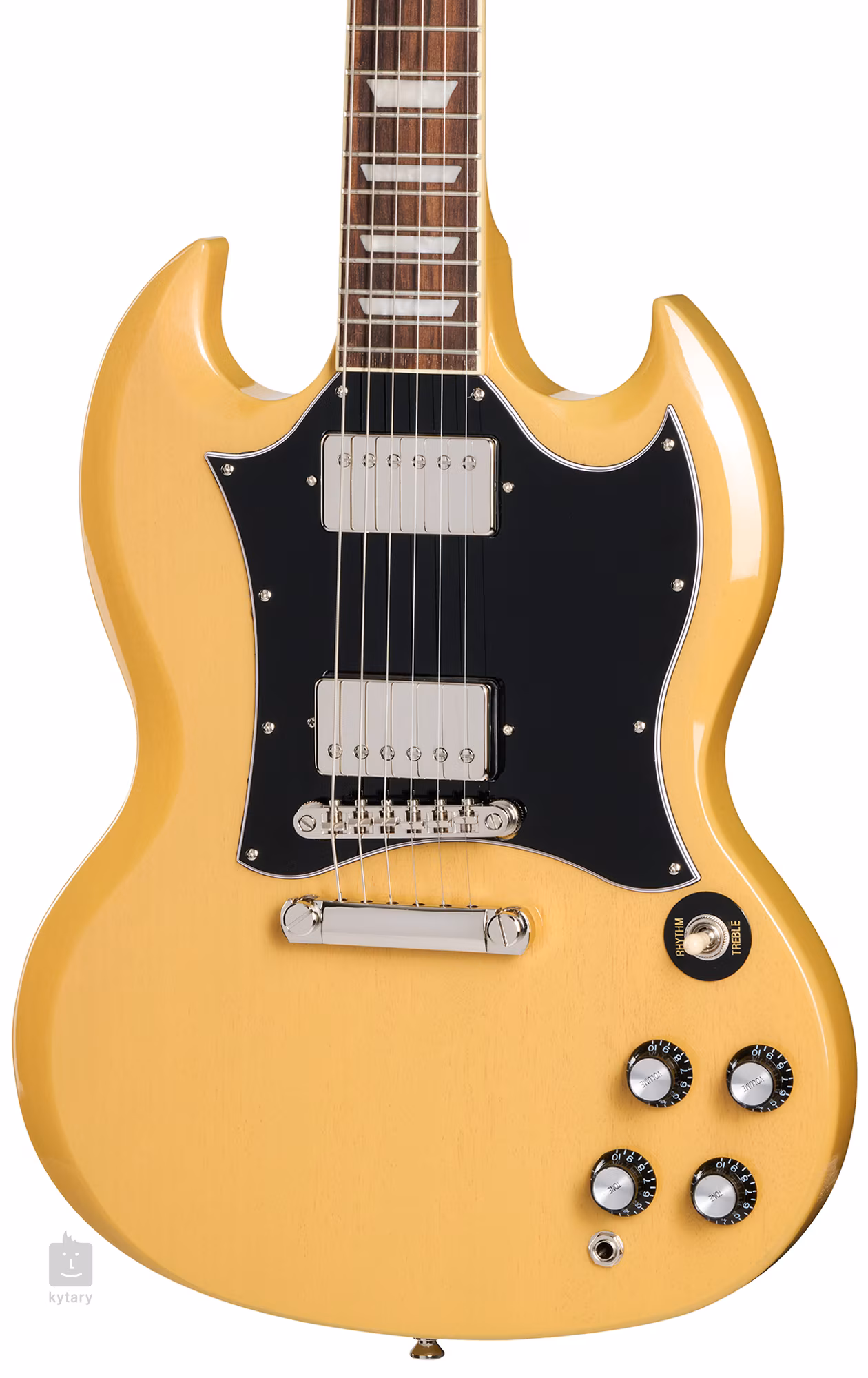 Der Korpus der SG Standard TV Yellow E-Gitarre ist aus Mahagoni gefertigt. Der Mahagoni-Hals mit einem komfortablen und schnellen SlimTaper "C"-Profil ist auf ein Feigengriffbrett mit zweiundzwanzig Medium-Jumbo-Bünden geleimt. Positionierungsblöcke aus Perlmuttimitat erleichtern die Orientierung auf dem Griffbrett.