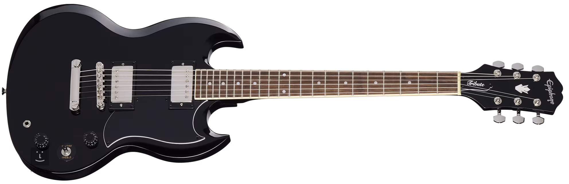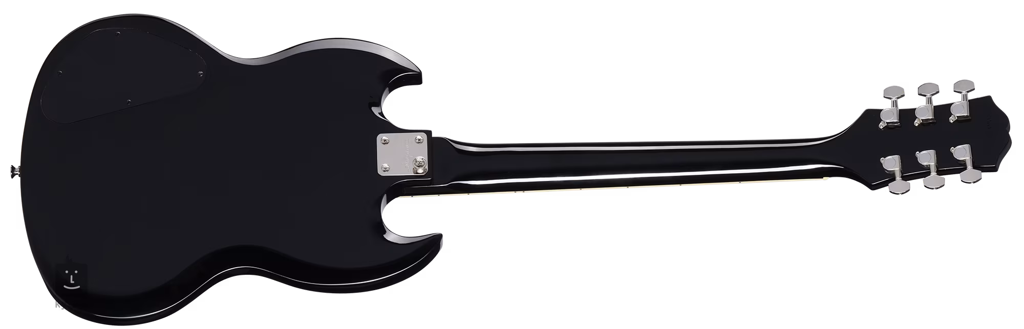Der Korpus der E-Gitarre SG Tribute Ebony ist aus Mahagoni gefertigt. An den Mahagonihals mit angenehm abgerundetem „C“-Profil ist ein Griffbrett aus Feigenholz mit 22 Medium-Jumbo-Bünden aufgeklebt. Positionsmarkierungen erleichtern die Orientierung auf dem Griffbrett.
