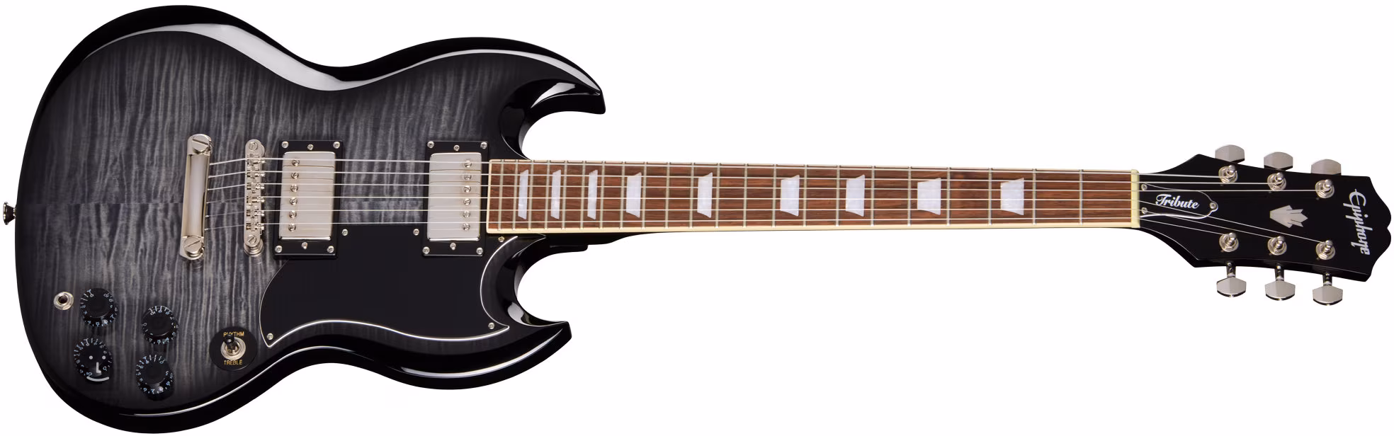 Der Mahagonikorpus der E-Gitarre SG Tribute Plus Ebony Burst ist mit einem auffälligen Furnier aus geflammtem Ahorn (Flamed Maple) verziert. Die Maserung des Ahorns wird durch den Glanzlack und das Ebony-Burst-Finish hervorgehoben. Auf den Mahagonihals ist ein Griffbrett aus Feigenholz geklebt, das mit 22 Medium-Jumbo-Bünden besetzt ist. Positionsmarkierungen aus Perlmuttimitat erleichtern die Orientierung auf dem Griffbrett.