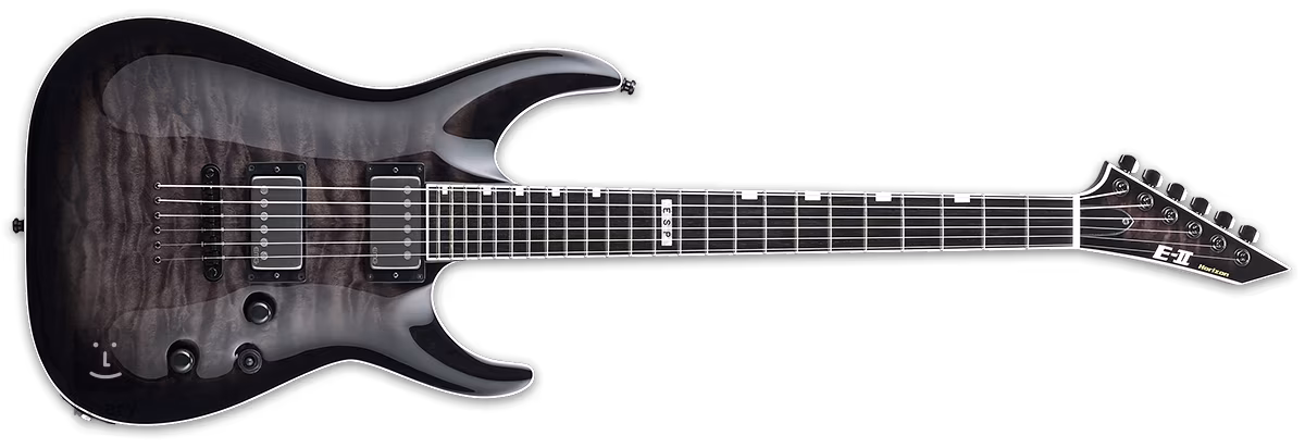 Auf den ersten Blick beeindruckt diese E-II Horizon NT-II E-Gitarre mit ihrer Puffahorndecke mit See Thru Black Sunburst Lackierung und kontrastierendem hellem Binding. Der Korpus der Gitarre selbst ist aus Mahagoni gefertigt. Ein dreiteiliger Ahornhals mit schmalem U-Profil wird durch ein Ebenholz-Griffbrett mit vierundzwanzig Extra-Jumbo-Bünden ergänzt. Die Orientierung auf der Oberfläche wird durch Positionsblöcke aus Perlmutt erleichtert.
