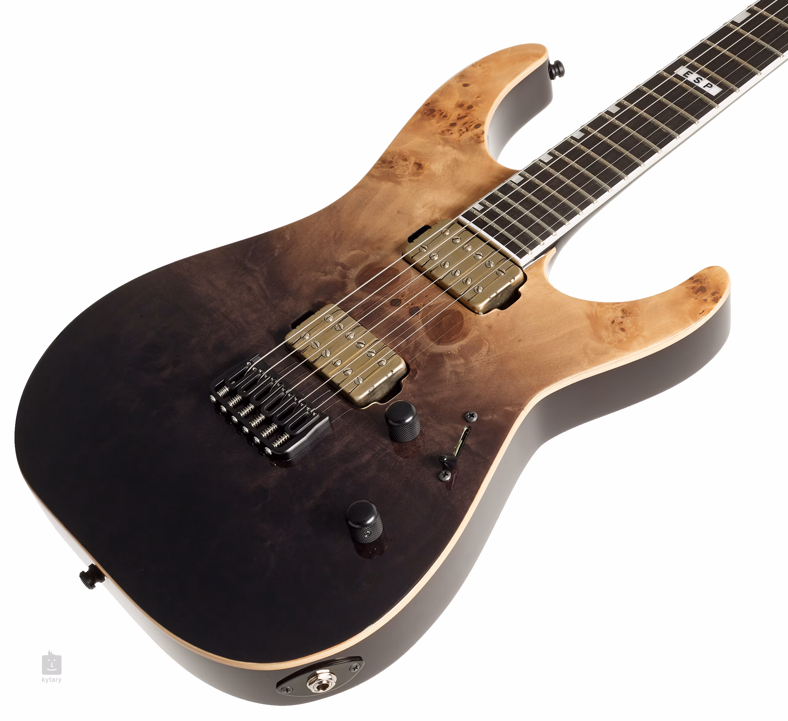 Die E-II M-II NT E-Gitarre besticht auf den ersten Blick durch ihr beeindruckendes Black Natural Fade-Finish, das im Kontrast zum cremefarbenen Korpus und Kopfplatten-Binding steht. Der Korpus des Instruments selbst ist aus Mahagoni und einer wunderschönen Ahorndecke (Buckeye Burl Maple) gefertigt. Ein Ebenholz-Griffbrett mit vierundzwanzig Extra-Jumbo-Bünden ist auf einen dreiteiligen Ahornhals mit einer Set-Thru-Konstruktion geklebt, d.h. einem tief in den Korpus eingelassenen Hals und einem schmaleren Fast-Thin-U-Profil. Die Orientierung auf der Oberfläche wird durch versetzte Positionsmarkierungen erleichtert.