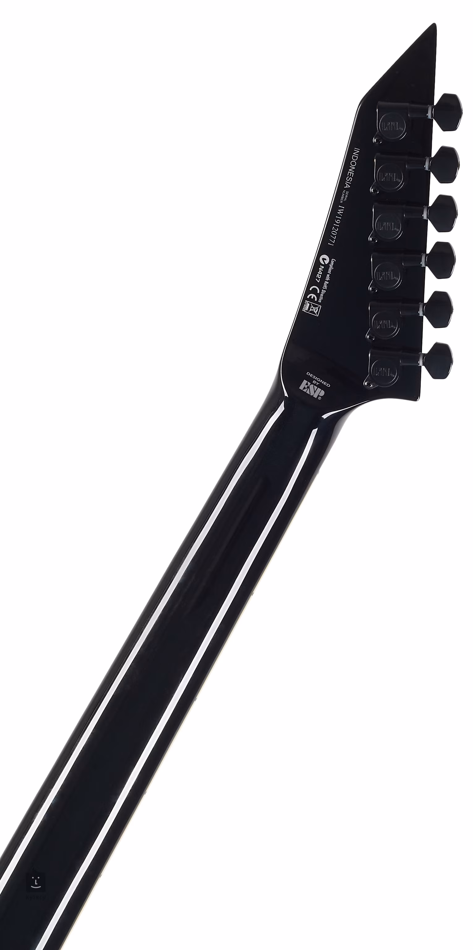 Ein dreiteiliger Ahornhals ist auf den Mahagonikorpus des Instruments geleimt. Vierundzwanzig Extra-Jumbo-Bünde unterteilen das "gebackene" Jatoba-Griffbrett. Die Orientierung wird durch Positionsblöcke aus Perlmutt erleichtert. Die Saiten sind in den hauseigenen Stimmmechaniken und in dem bereits erwähnten Floyd-Rose-Tremolo gelagert. Die Stimmstabilität bei Verwendung des Tremolohebels wird durch die Verriegelungen am Nullbund gewährleistet, die wie der Korpus des Instruments und die gesamte Hardware in einem stilvollen schwarzen Finish gehalten sind. Die Tonabnahme übernimmt ein Paar passiver ESP Designed Humbucker, deren Spulen bei Bedarf mit dem Push/Pull-Schalter am Volume-Potentiometer abgeklemmt werden können. Das erweitert die klanglichen Möglichkeiten des Instruments erheblich, und nicht nur Fans kompromissloser Metal-Sounds, sondern auch Liebhaber des angenehmen, klirrenden Sounds von Single-Coil-Tonabnehmern werden sich freuen.