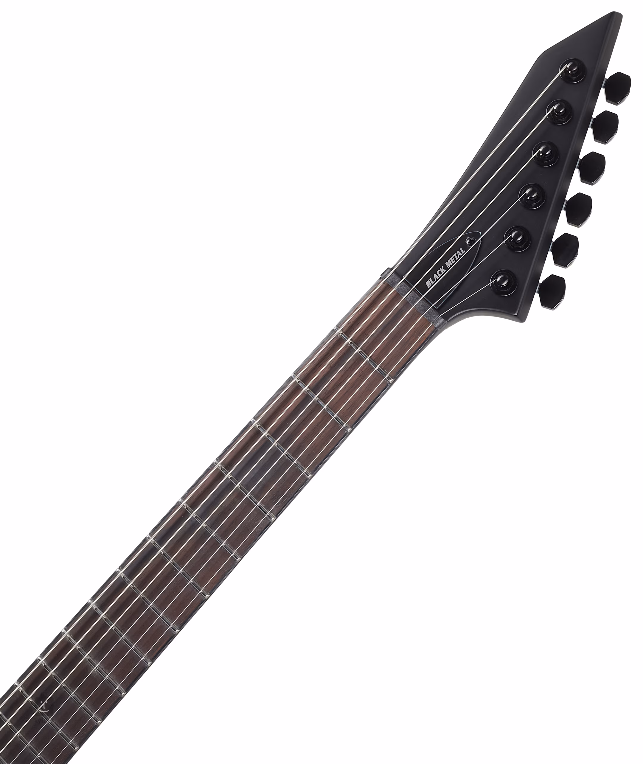 Die "V"-Konstruktion der Arrow-NT Black Metal besteht aus Mahagoni-Flügeln und einem dreiteiligen Ahorn-Hals mit einem schmalen, schnellen Thin-U-Profil. 24 Extra-Jumbo-Bünde aus rostfreiem Stahl unterteilen das Ebenholz-Makassar-Griffbrett.