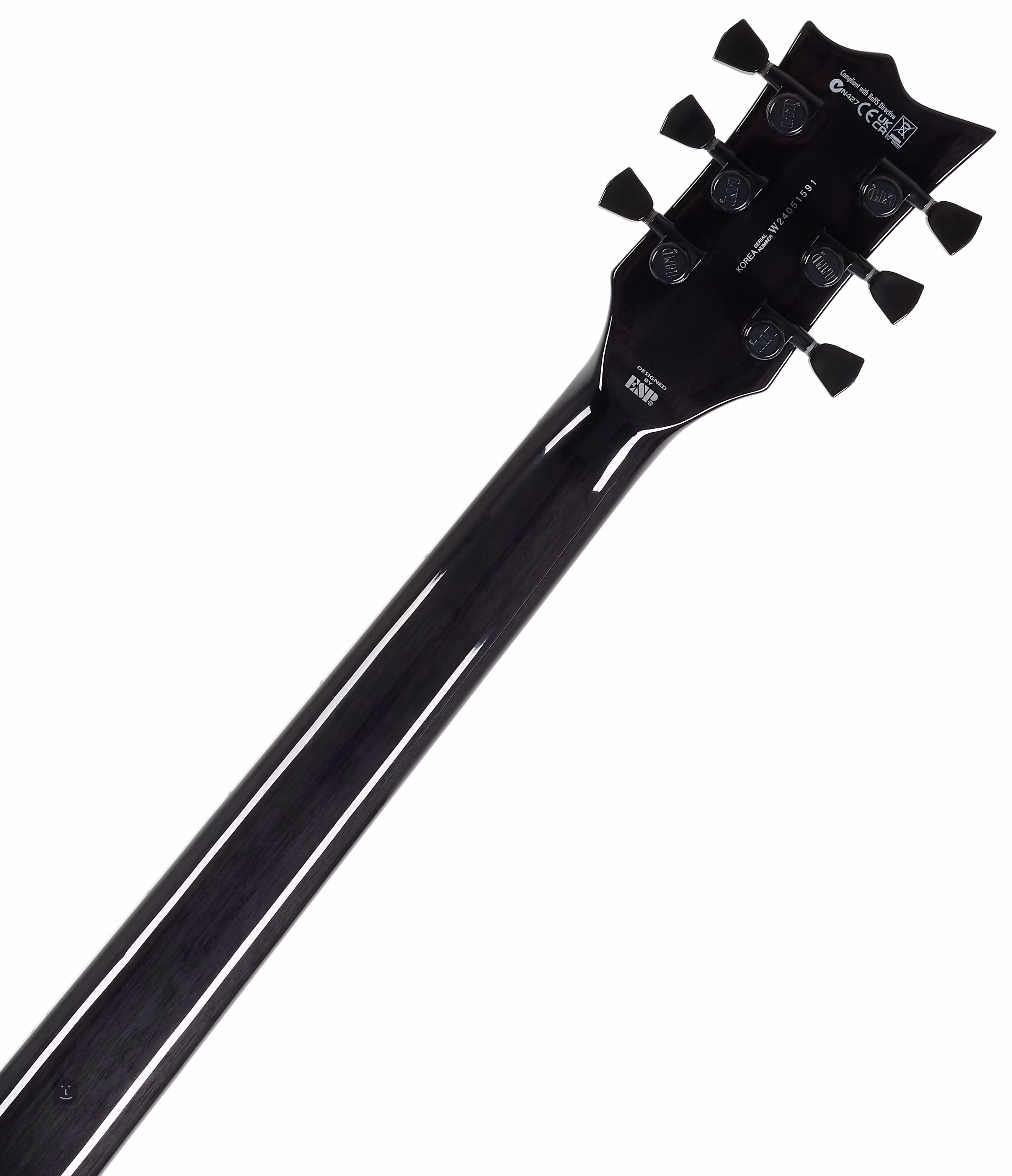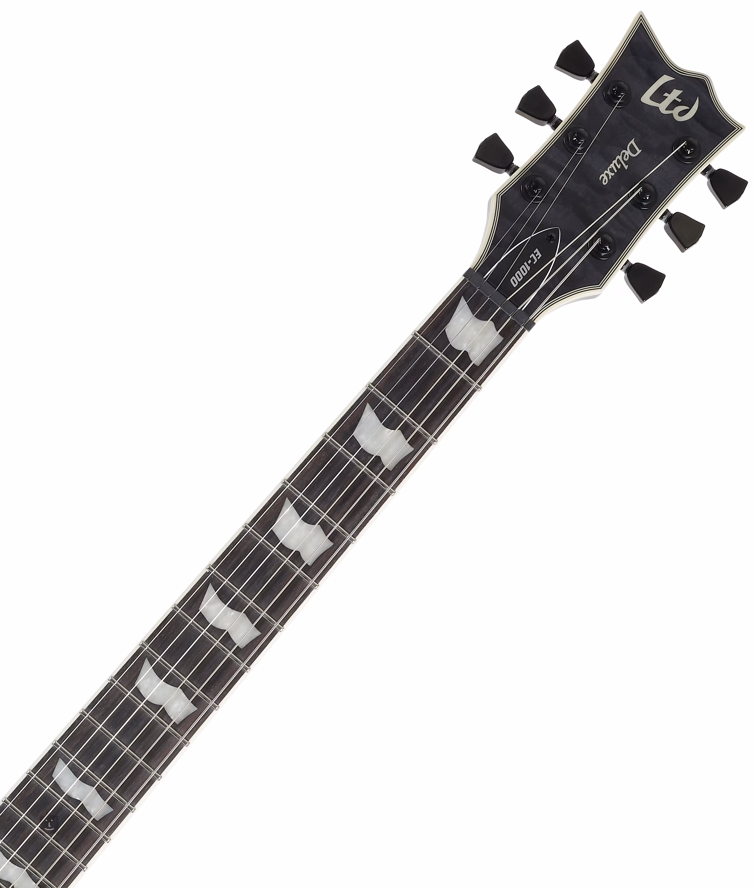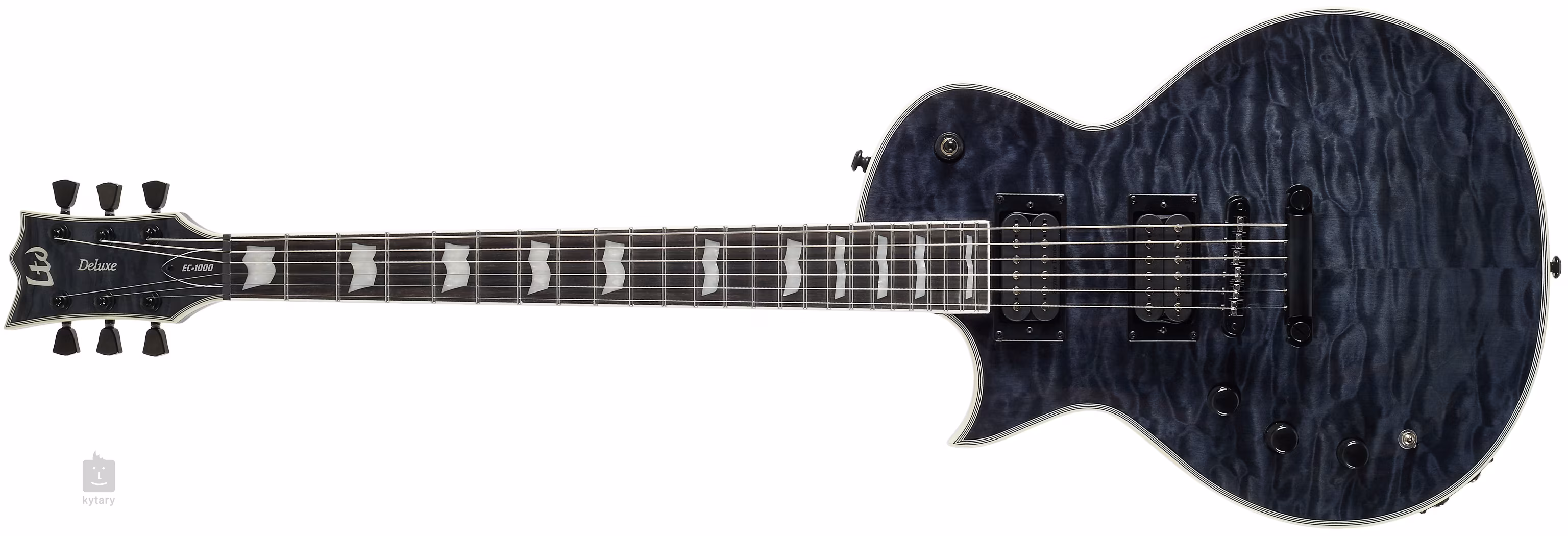 Der Korpus der Gitarre besteht aus Mahagoni mit einem ausgefallenen Deckenfurnier aus geflammtem Ahorn. Das Binding um den Korpus, den Hals und die Kopfplatte kontrastiert gut mit dem Farbschema des Instruments. Ein dreiteiliger Mahagoni-Hals mit einer Set-Thru-Konstruktion, d.h. einem tief in den Korpus eingelassenen Hals, wird durch ein Pau-Ferro-Griffbrett mit vierundzwanzig Extra-Jumbo-Bünden ergänzt. Die Orientierung wird traditionell durch Positionsblöcke aus Perlmutt erleichtert. Die Saiten sind auf der einen Seite in den hochwertigen LTD Locking-Mechaniken des Unternehmens und auf der anderen Seite in den Saitenreitern montiert. Die schwarze Hardware und das Logo auf der Kopfplatte unterstreichen das stilvolle Aussehen der Gitarre.
