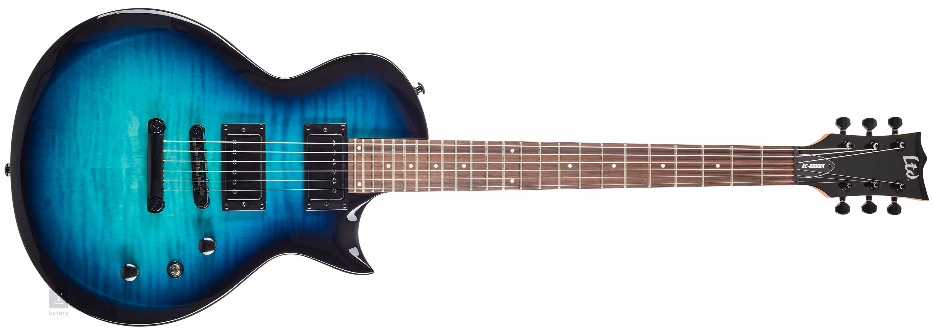 Der flache Pappelkorpus mit abgerundeten Kanten des EC-200DX BLUE BURST Modells ist mit einem spektakulären Furnier aus geflammter Ahorndecke verziert. Ein Palisander-Griffbrett mit vierundzwanzig Extra-Jumbo-Bünden ist auf einen geschraubten Hals aus geröstetem Ahorn geklebt. Positionspunkte auf dem Griffbrett erleichtern die Orientierung.