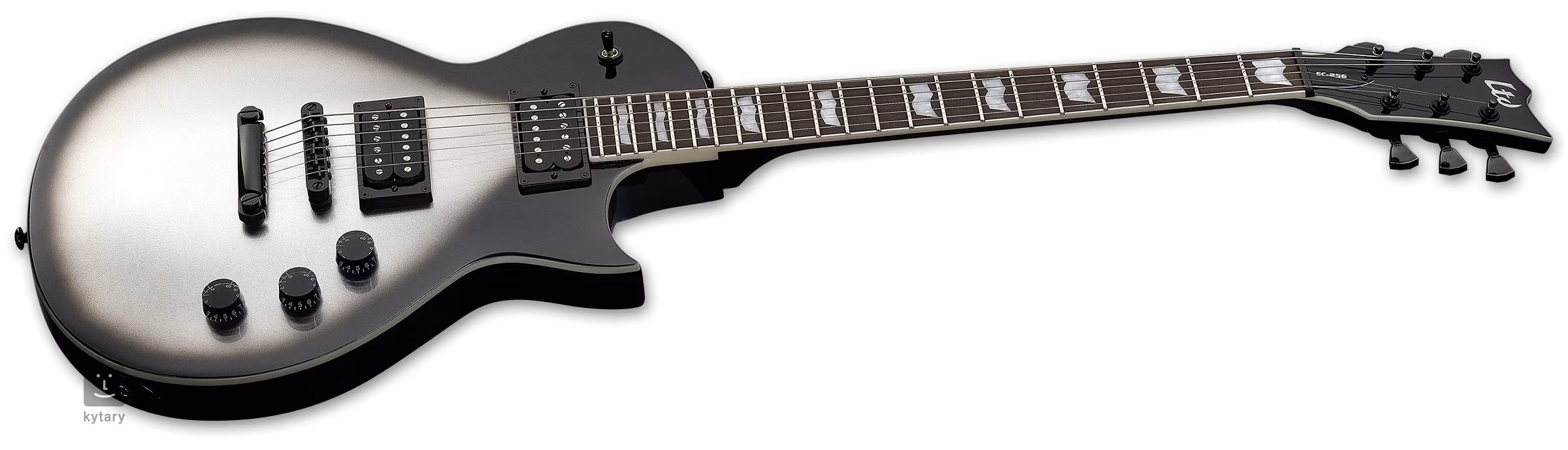 Der Korpus der EC-256 Silver Sunburst Teardrop Gitarre ist aus Mahagoni gefertigt. Der schmale dreiteilige Mahagoni-Hals mit "Thin U"-Profil ist auf ein Palisander-Griffbrett mit zweiundzwanzig Extra-Jumbo-Bünden geleimt. Die Orientierung auf dem Griffbrett wird durch Positionsmarkierungen im ESP Flag Design erleichtert.