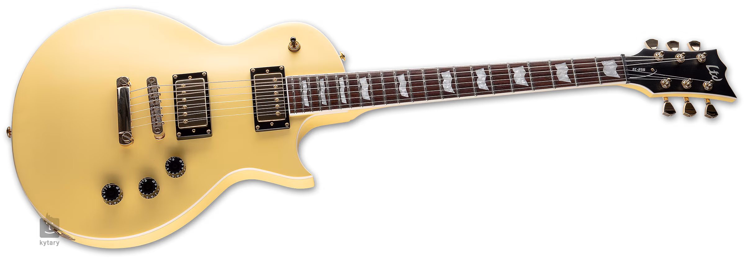 Der Mahagoni-Korpus der EC-256 VINTAGE GOLD SATIN ist mit einer Vintage Gold Satin-Lackierung und hellem Perimeter-Binding versehen. Der schmale dreiteilige Mahagoni-Hals mit "Thin U"-Profil ist auf ein geröstetes Jatoba-Griffbrett mit zweiundzwanzig Extra-Jumbo-Bünden geleimt. Die Ausrichtung des Griffbretts wird durch Positionsblöcke aus Perlmuttimitation erleichtert.