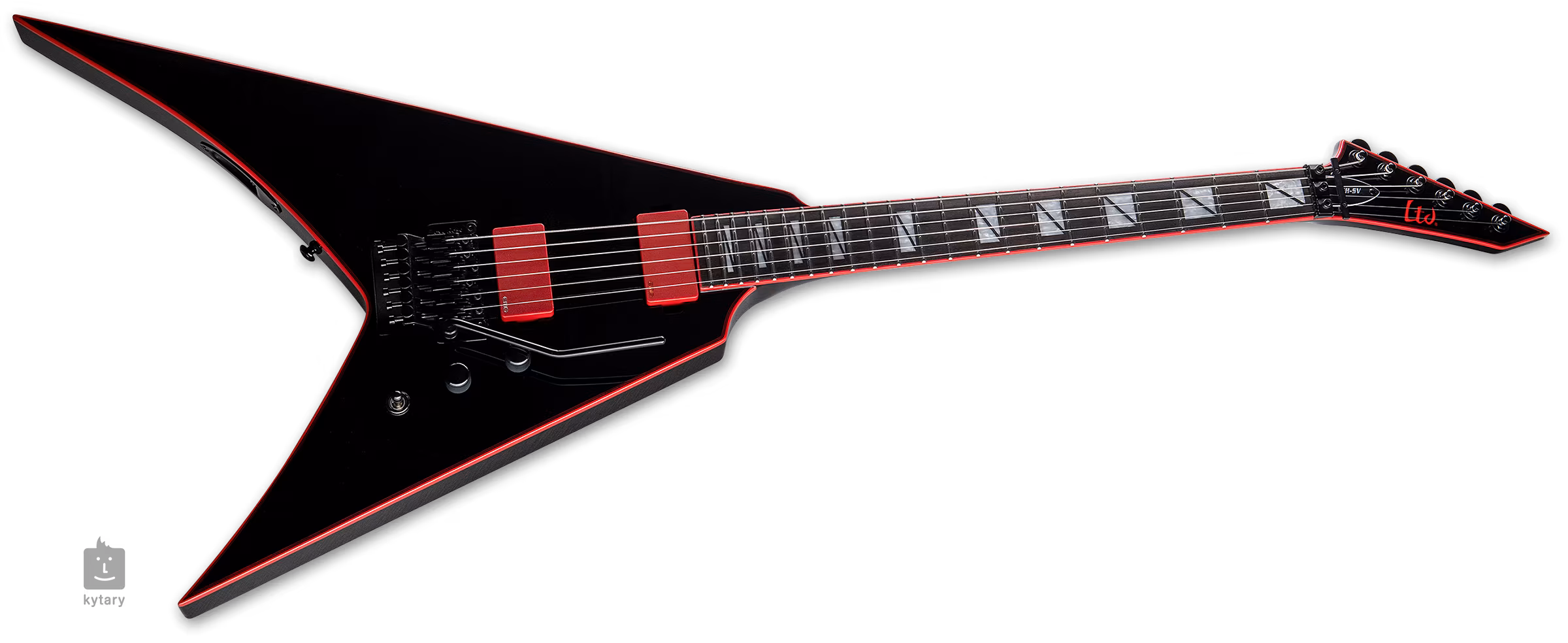Es handelt sich um eine „V-Form“-Gitarre in einem rein metal-typischen schwarz-roten Design. Die Konstruktion der Gitarre besteht aus Mahagoni-Korpusseiten, einer breiteren Ahorn-Decke (Maple Cap) und einem dreiteiligen durchgehenden Mahagoni-Hals. Die Griffbrettfläche aus Makassar-Ebenholz wird von 22 Extra-Jumbo-Bünden aus Edelstahl unterteilt. Die Orientierung auf dem Griffbrett wird durch Positionsmarkierungen aus Perlmuttimitat in einem speziellen Design erleichtert.