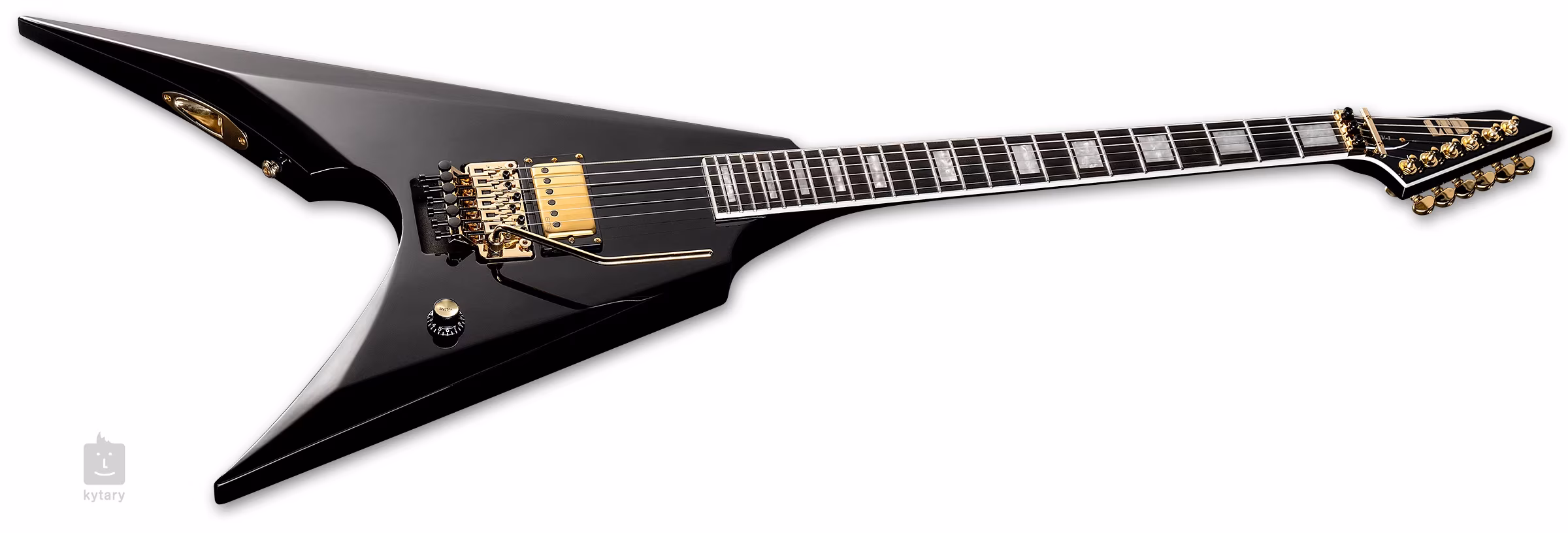 Ein aktiver EMG JH James Hetfield Cobbler Humbucker mit einer stilvollen Goldabdeckung verleiht der Gitarre einen saftigen High-Gain-Sound mit Punch und passiver Klarheit. Die Saiten sind in Grover-Mechaniken und einem Floyd Rose 1000-Tremolo untergebracht, um deinem Spiel beeindruckende Klangeffekte zu verleihen. Verriegelungen am Nullbund sorgen dafür, dass die Gitarre auch bei häufiger Betätigung des Tremolohebels gestimmt bleibt. Das stilvolle Finish wird durch goldene Hardware akzentuiert.