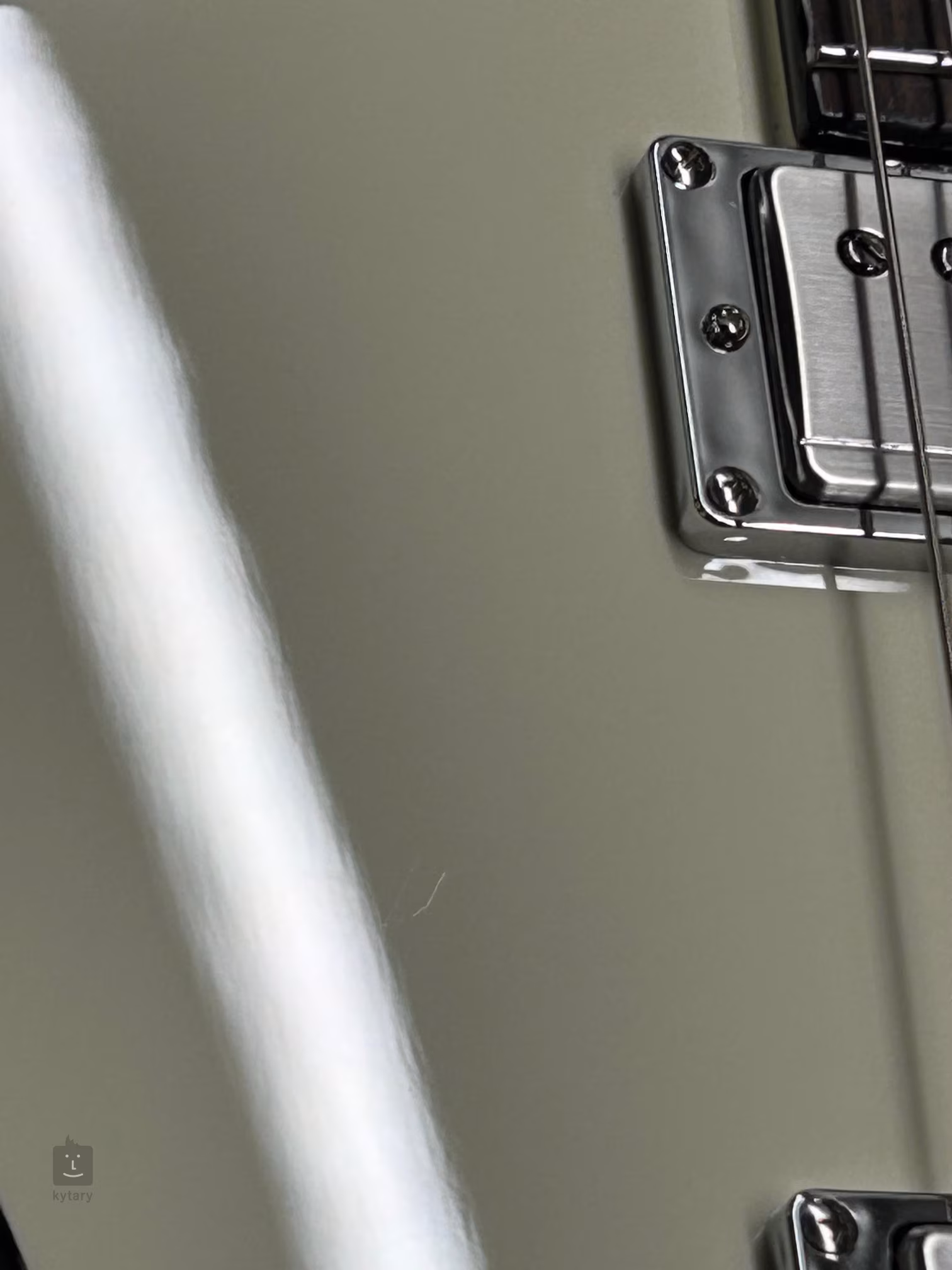 Die Saiten sind in der Locking-Mechanik des Unternehmens montiert, und auf Wunsch des Künstlers sind ein TonePros Locking-Saitenhalter und ein Saitenhalter versenkt/eingezogen. Das Styling wird durch das schwarze Perimeter-Binding auf dem Korpus, dem Griffbrett und der Kopfplatte, die RZK-Grafik auf der Rückseite des Korpus, das schwarze gebürstete Schlagbrett und die verchromte Hardware unterstrichen.